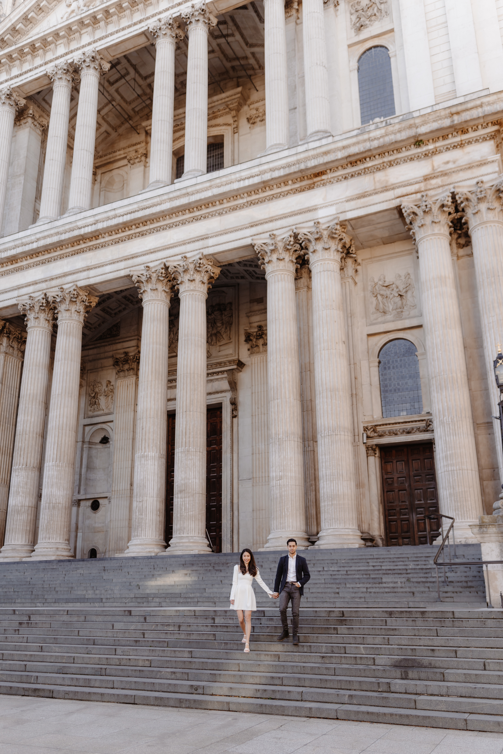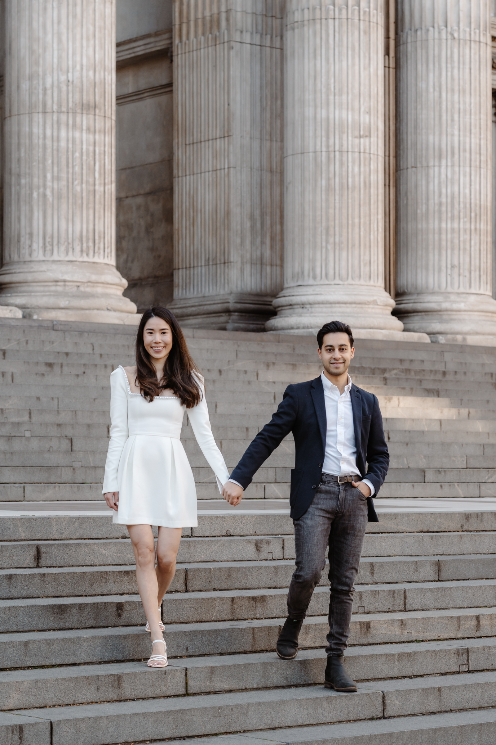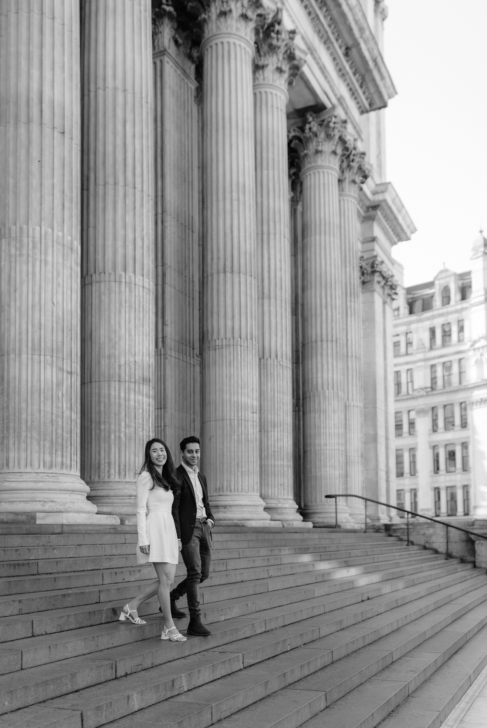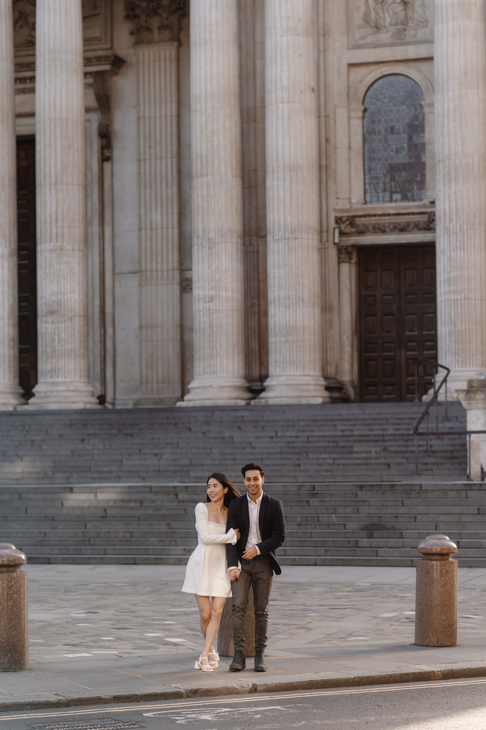 Penny and Aman chose to have their session in a part of London that’s genuinely meaningful to them – along their daily commute to work together in Bank. Starting somewhere personal always makes the session feel more natural, and it was lovely to photograph them in a setting that’s part of their everyday life.