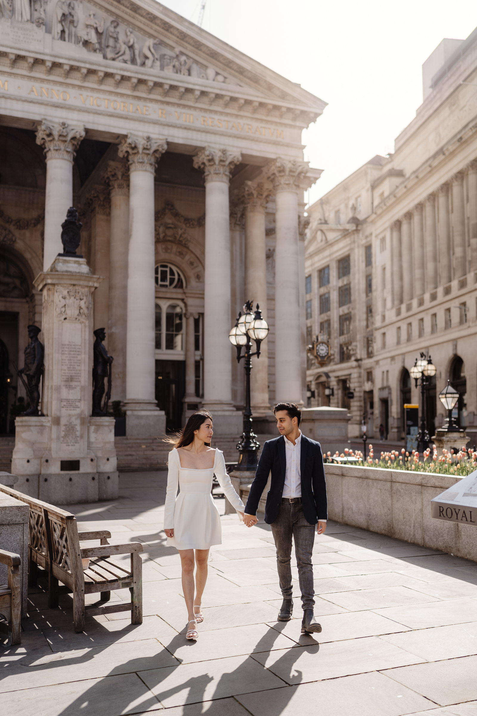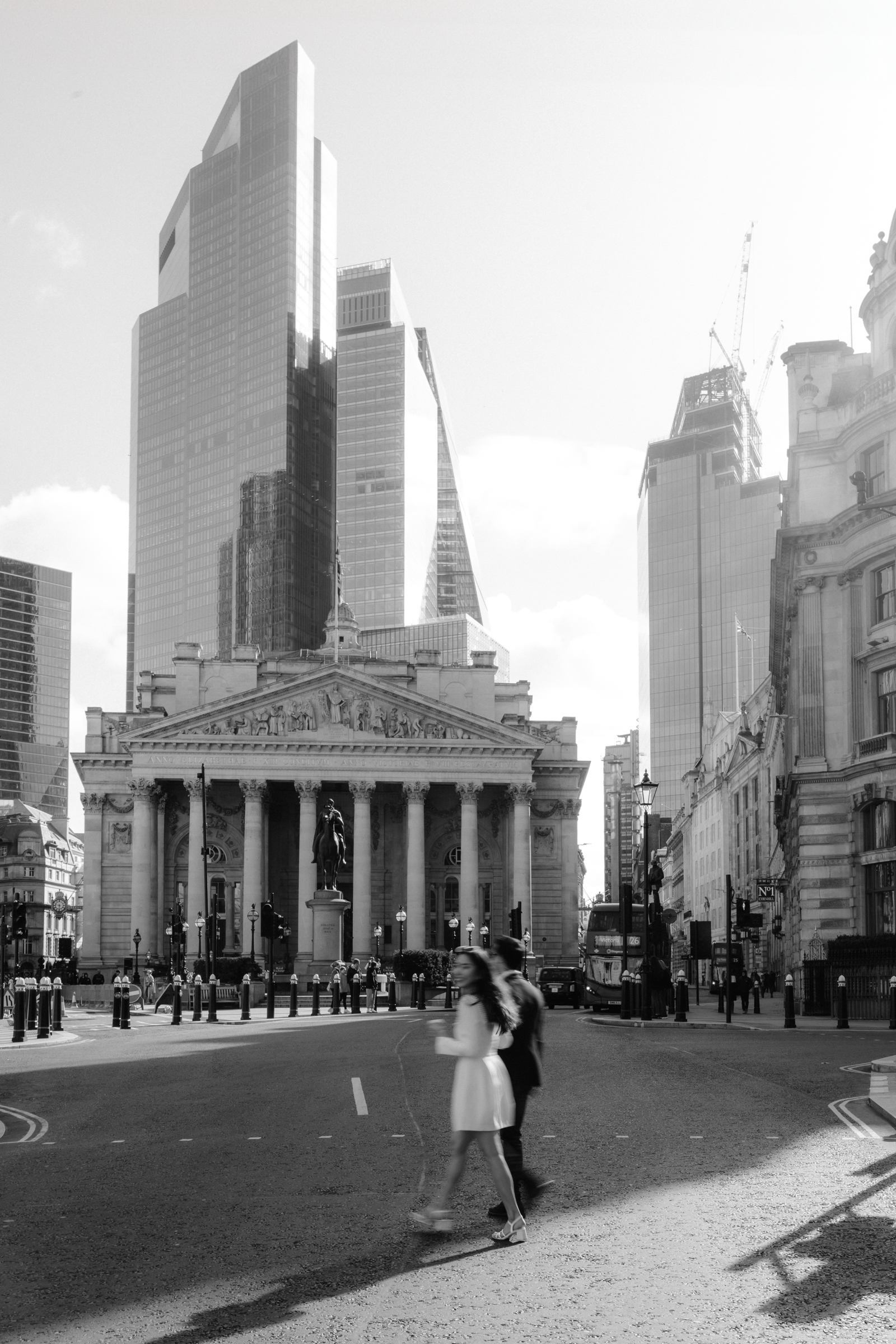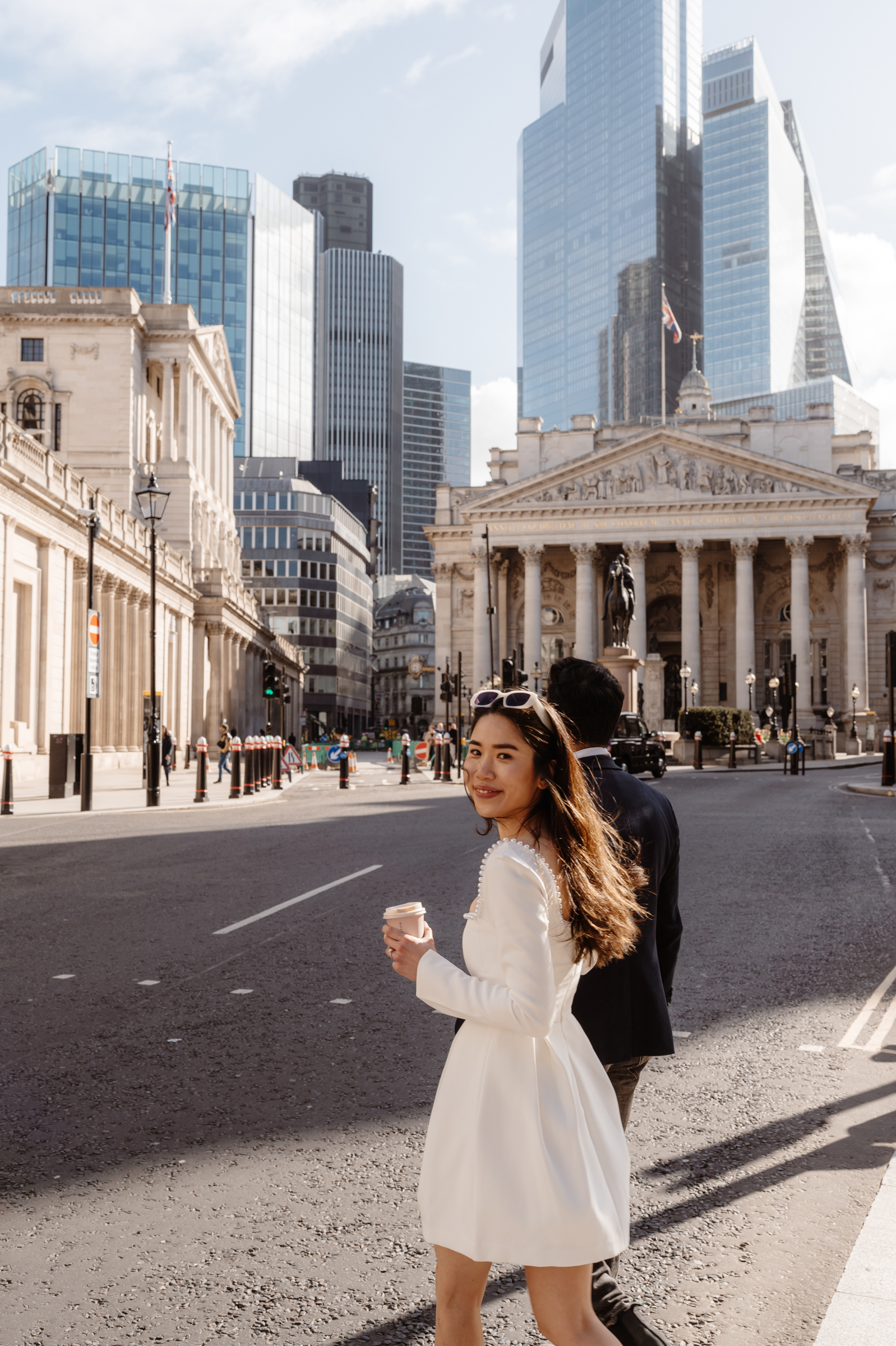 We also stopped at their favourite café, Rosslyn Coffee – a regular spot for them – which added a really relaxed, personal element to the shoot. Including places like this is such a simple way to make a pre-wedding session feel more reflective of who you are as a couple. Following our coffee stop, we wandered around the Royal Exchange and surrounding streets in Bank, using the mix of historic architecture and city backdrop.