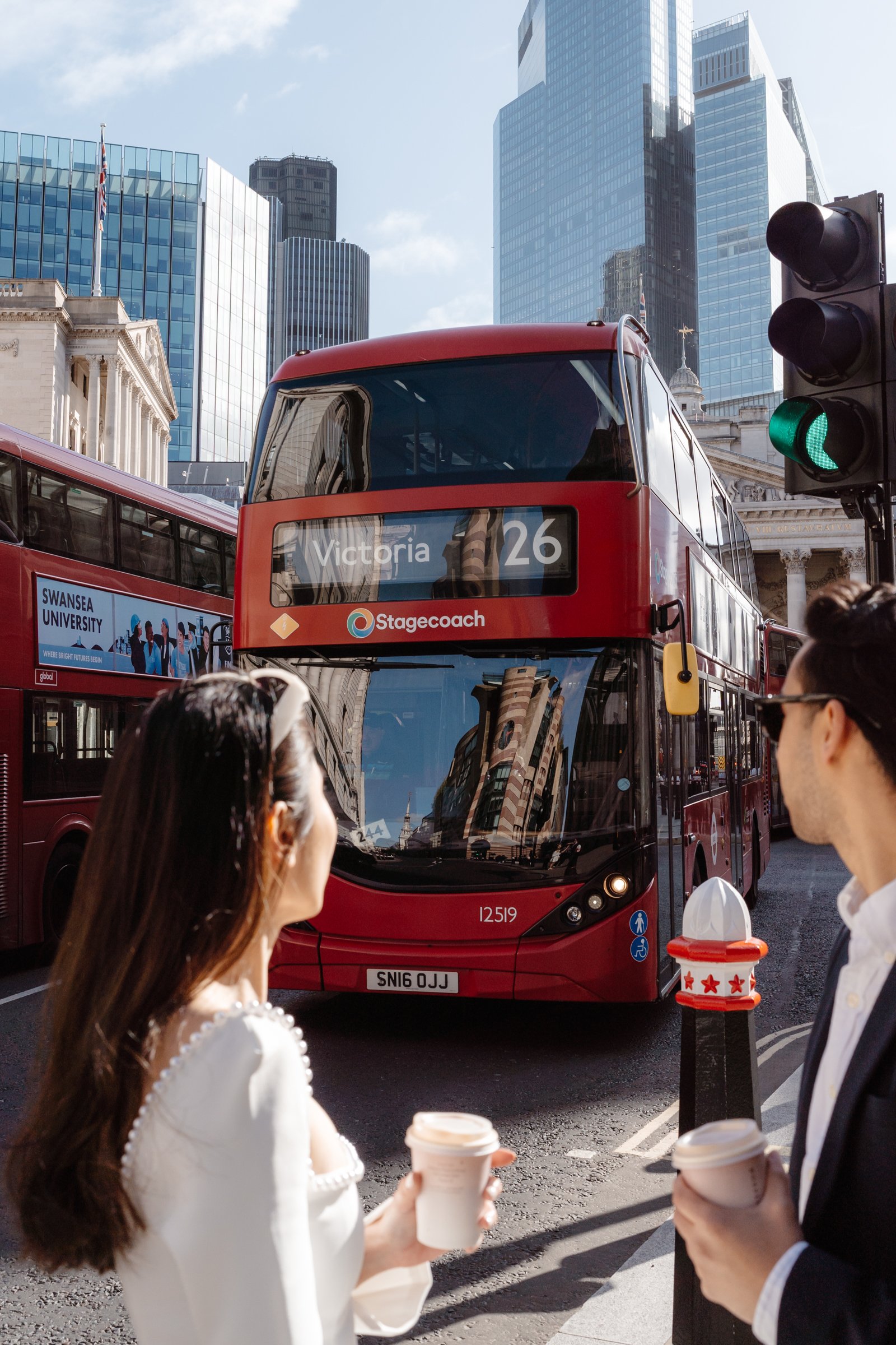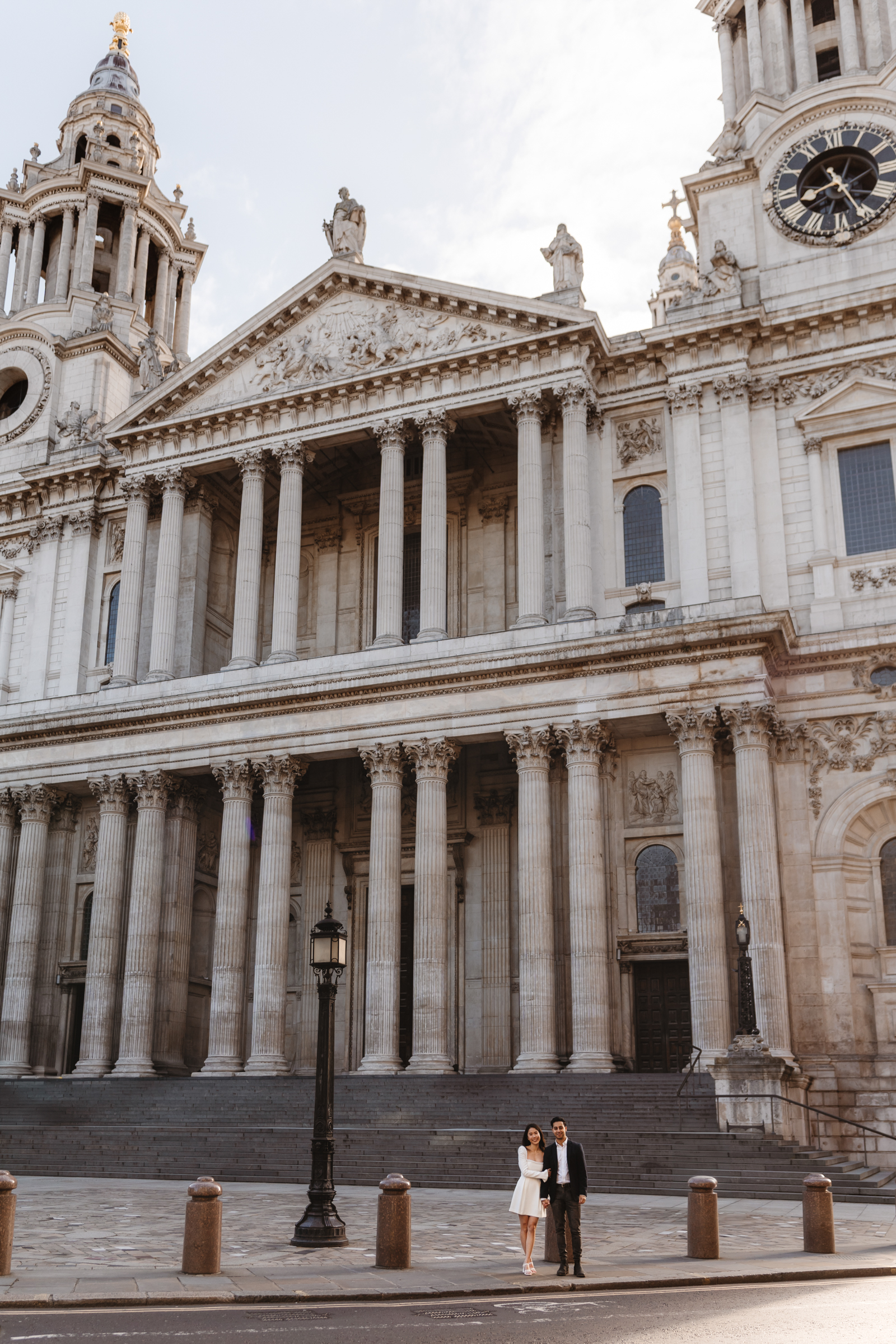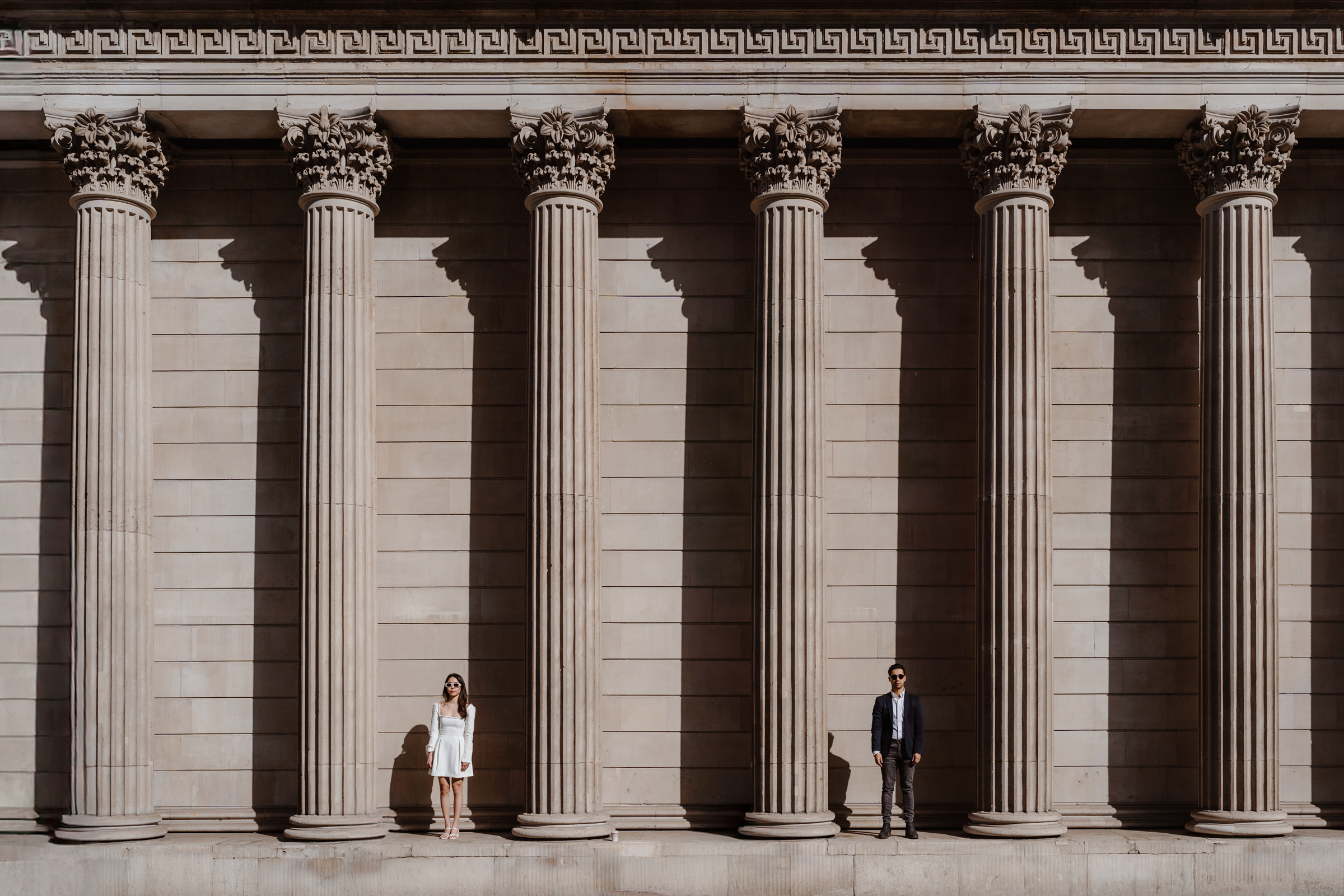 We also stopped at their favourite café, Rosslyn Coffee – a regular spot for them – which added a really relaxed, personal element to the shoot. Including places like this is such a simple way to make a pre-wedding session feel more reflective of who you are as a couple. Following our coffee stop, we wandered around the Royal Exchange and surrounding streets in Bank, using the mix of historic architecture and city backdrop.