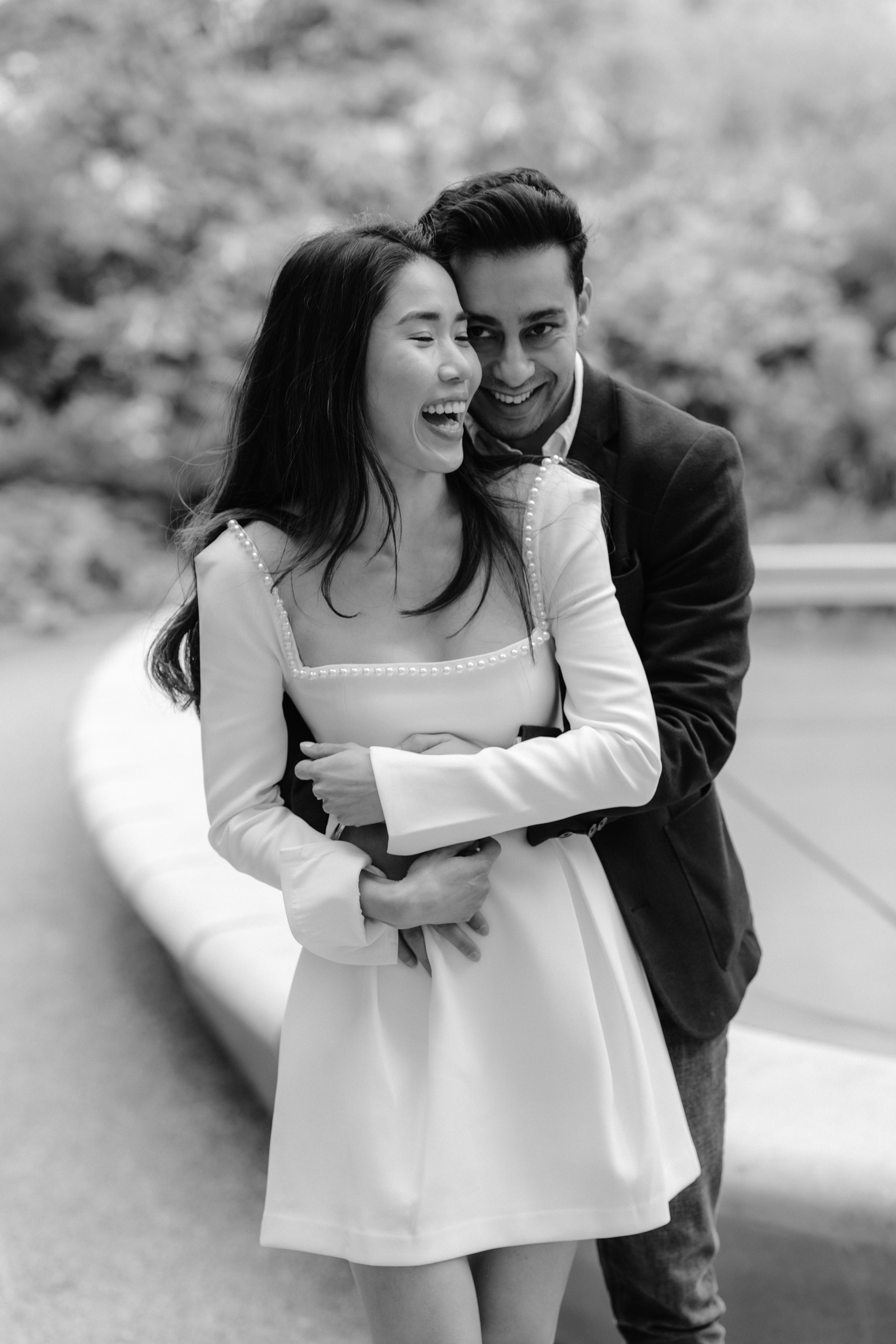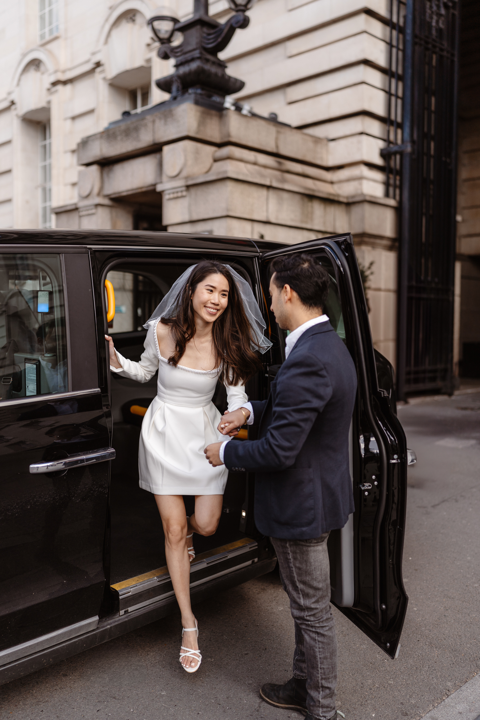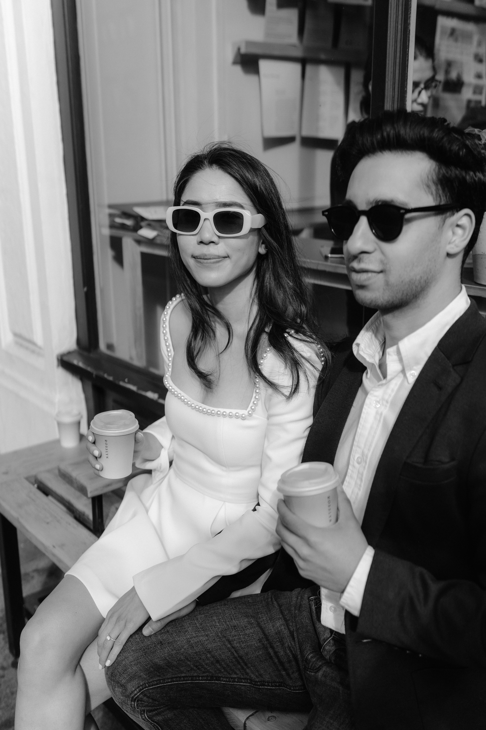 Penny wore a gorgeous bridal-white pearl-trim dress by Odd Muse London, styled with an optional fun veil and sunglasses, which gave the whole shoot a modern, fashion-forward feel while still keeping it relaxed and playful.