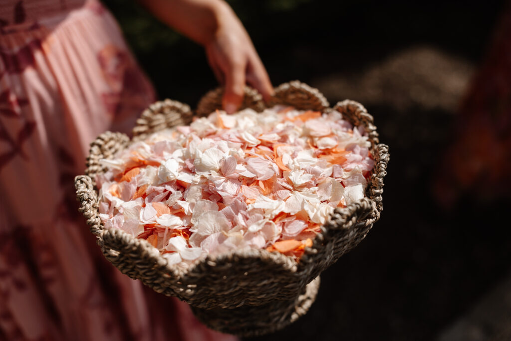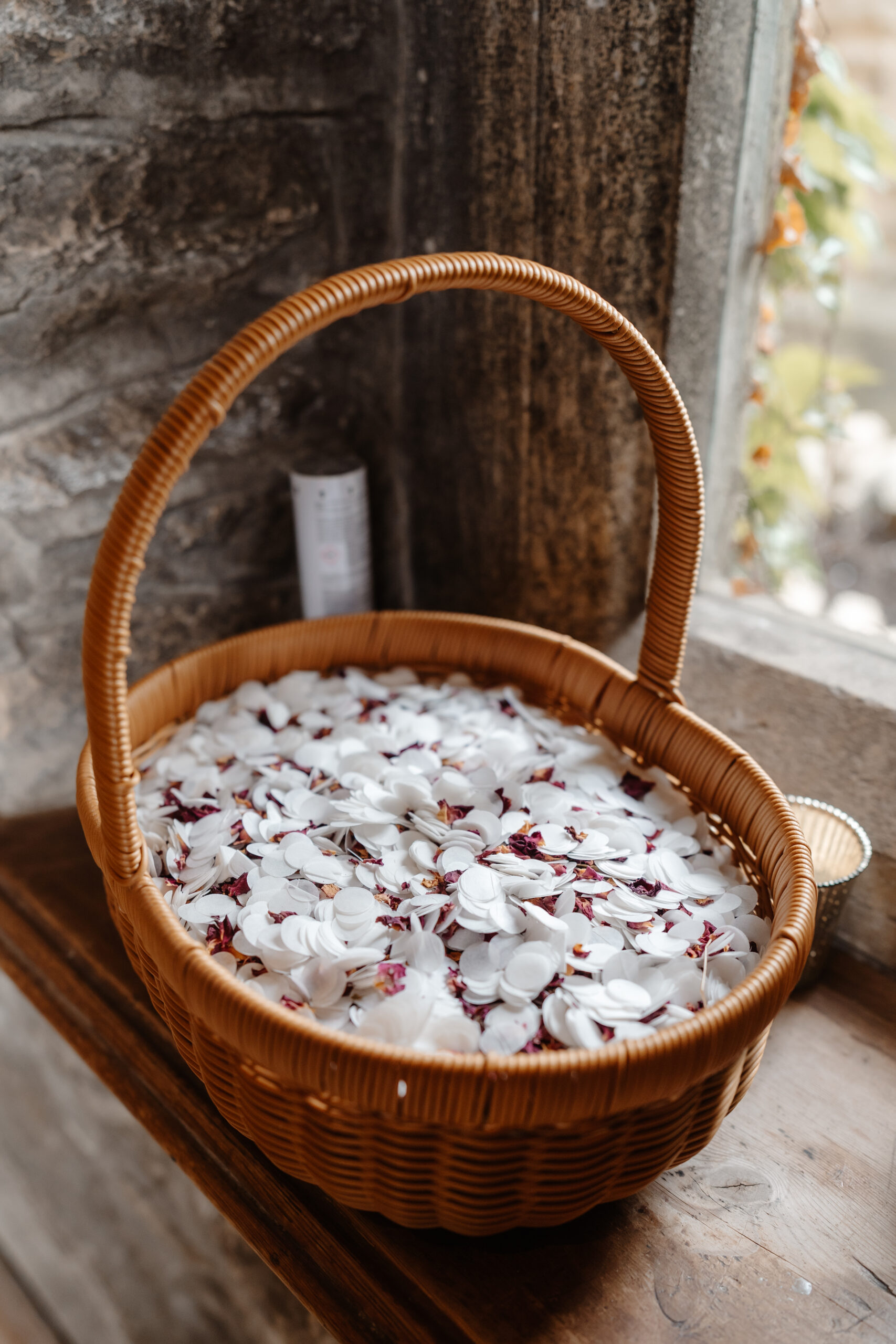 Make it easy to grab. Open baskets are ideal, as they encourage guests to take big handfuls, rather than small pinches. Sachets or cones might look lovely, but they often result in gentle sprinkles instead of confident throws. Plus the sachets / cones often get thrown at you alongside the confetti itself, which is not great for the photos or for you