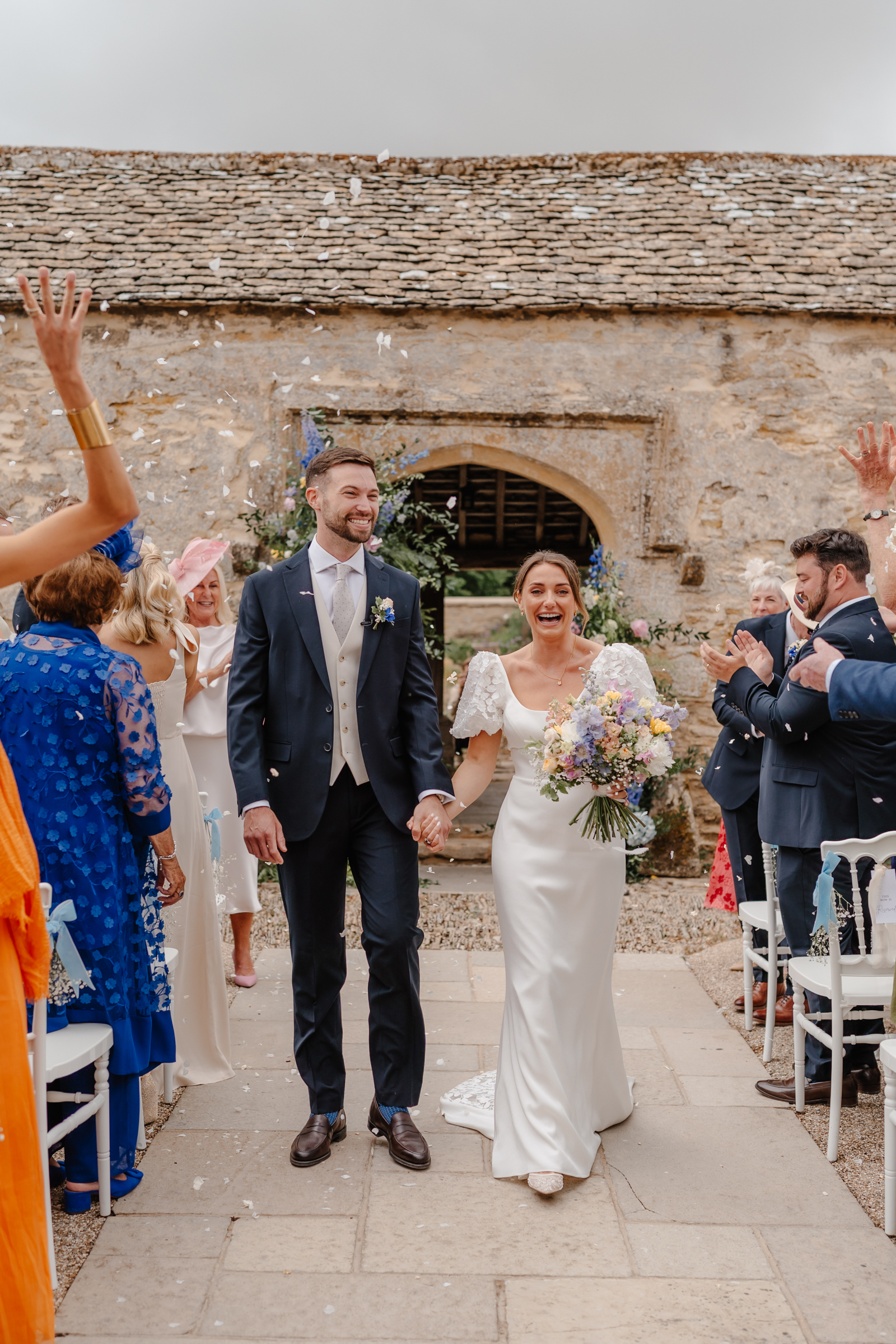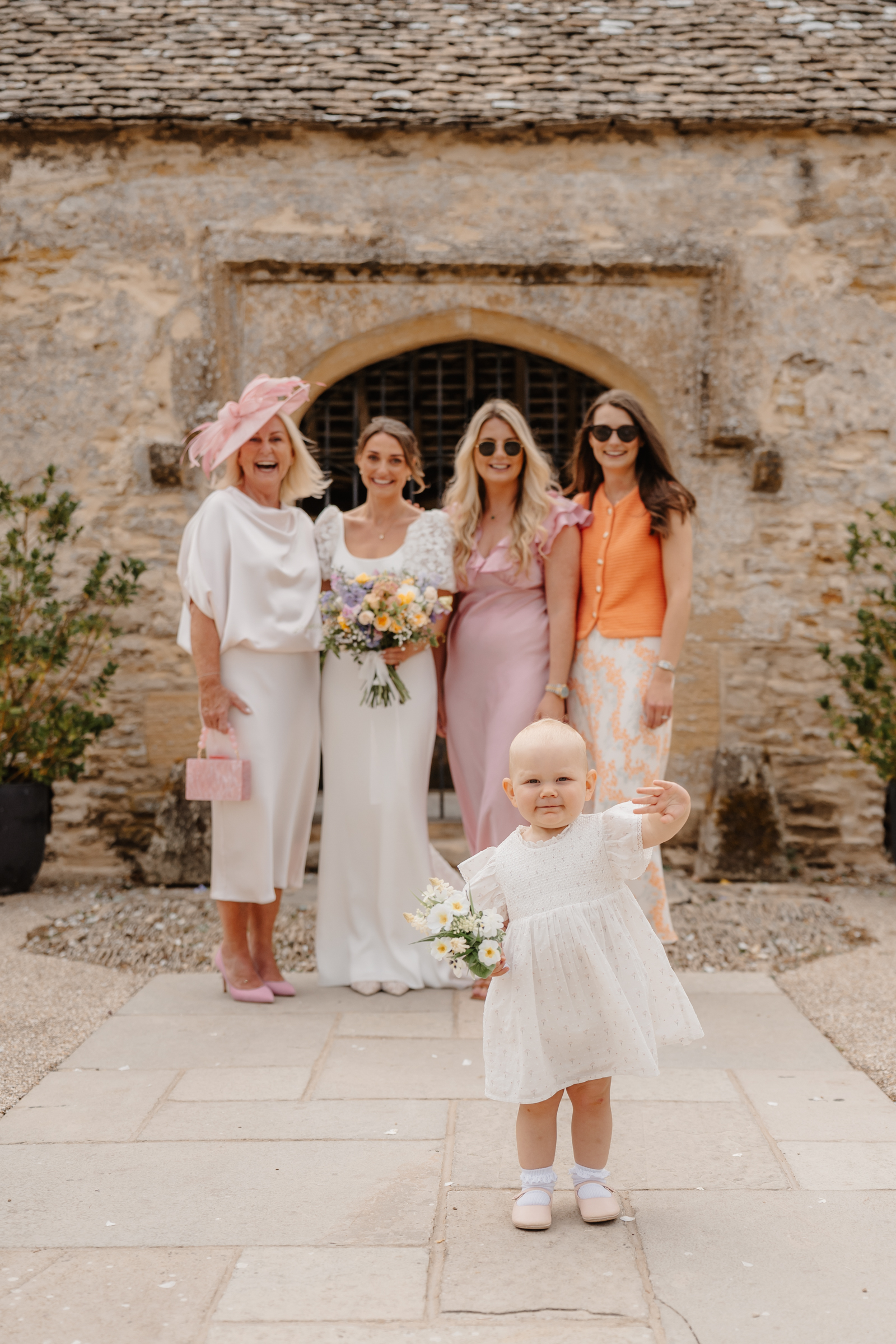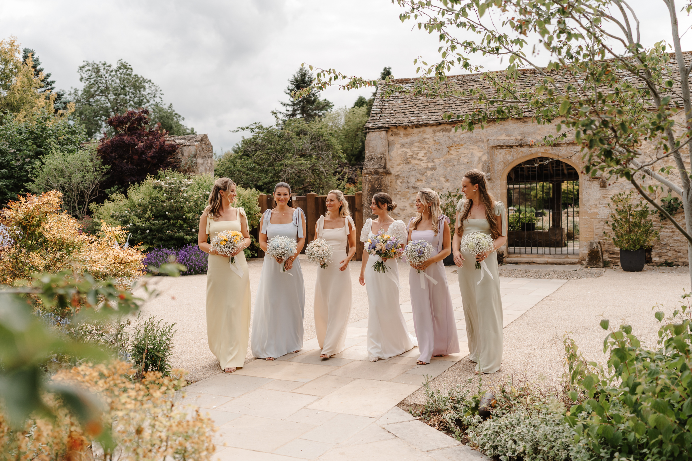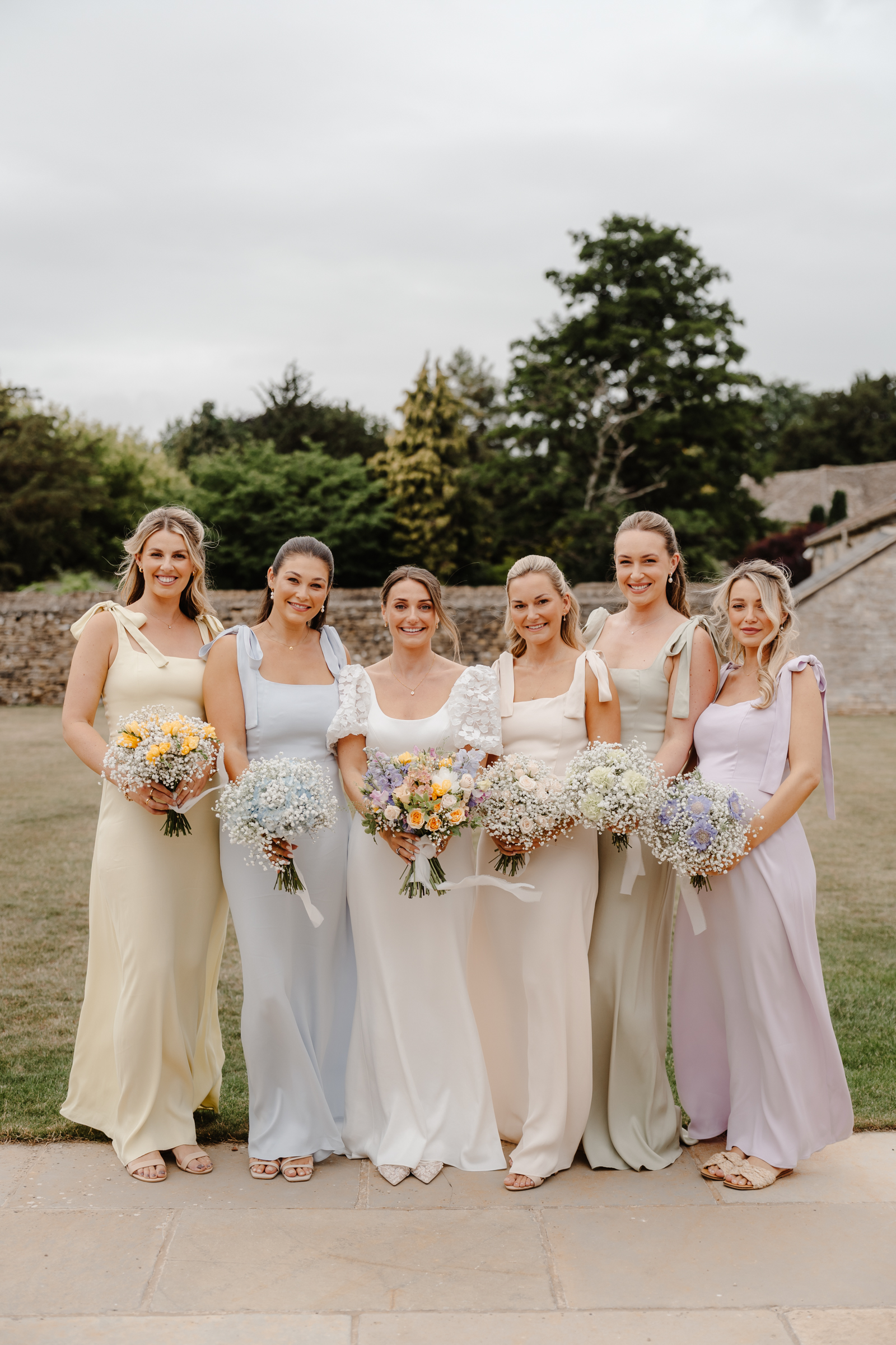 Bethan wore a stunning Sassi Holford ‘Ella’ dress with delicate puff lace sleeves – classic but distinctive in silhouette. Her bridesmaids wore a beautiful mix of pastel tones, each paired with florals in complementary shades – a palette that sat beautifully against the Cotswold stone backdrop.