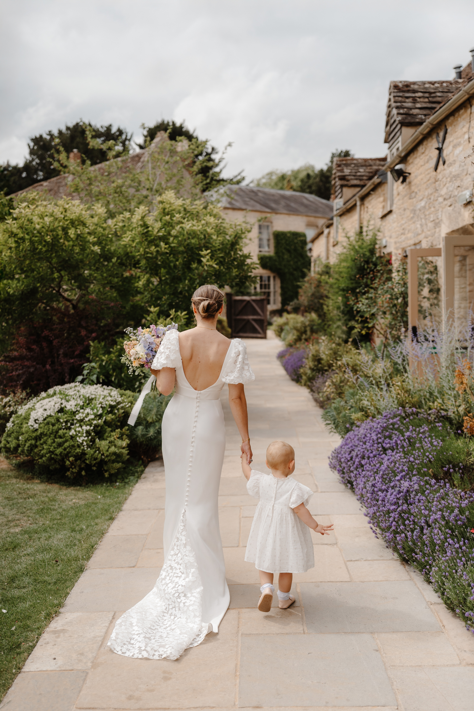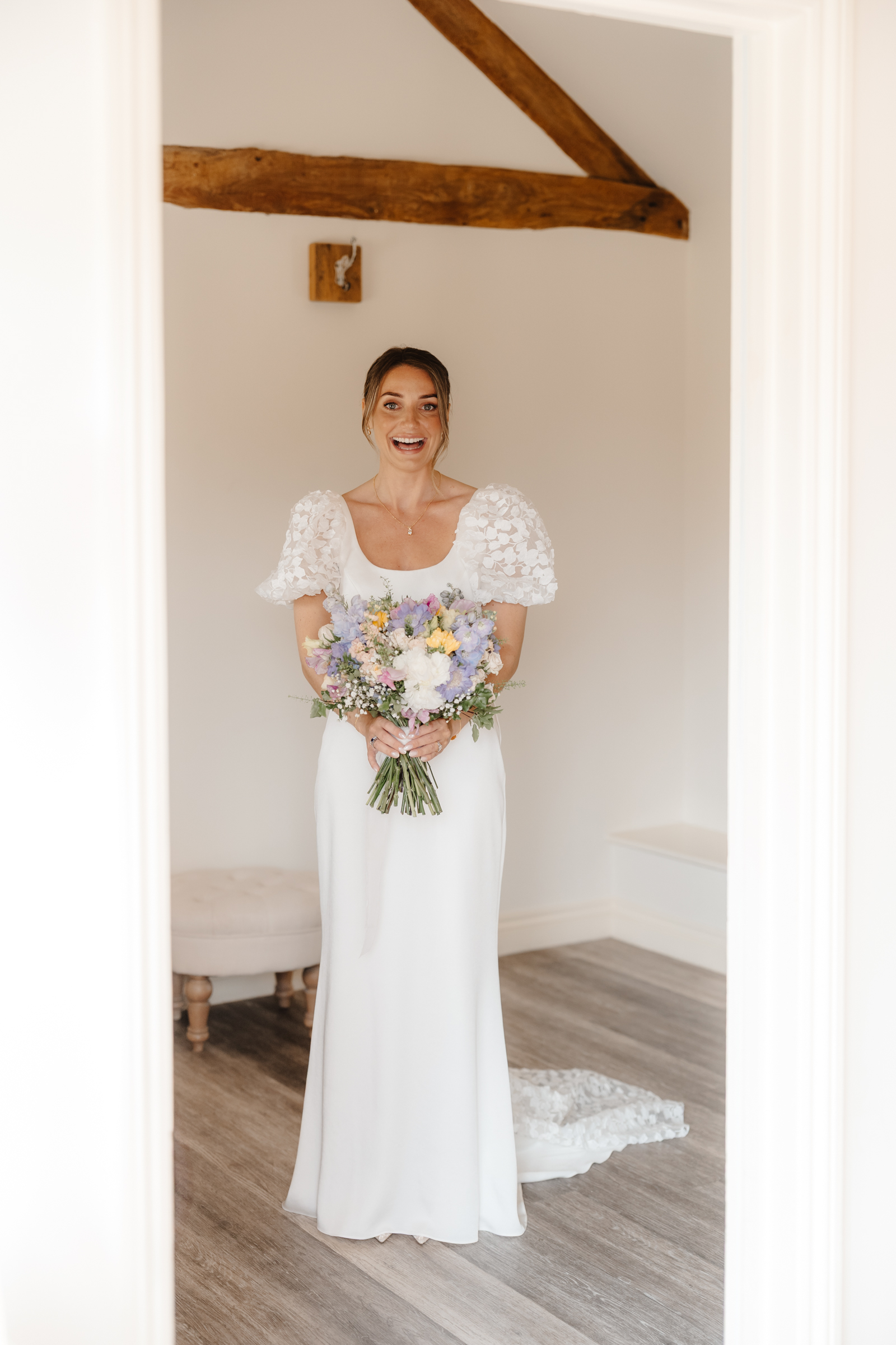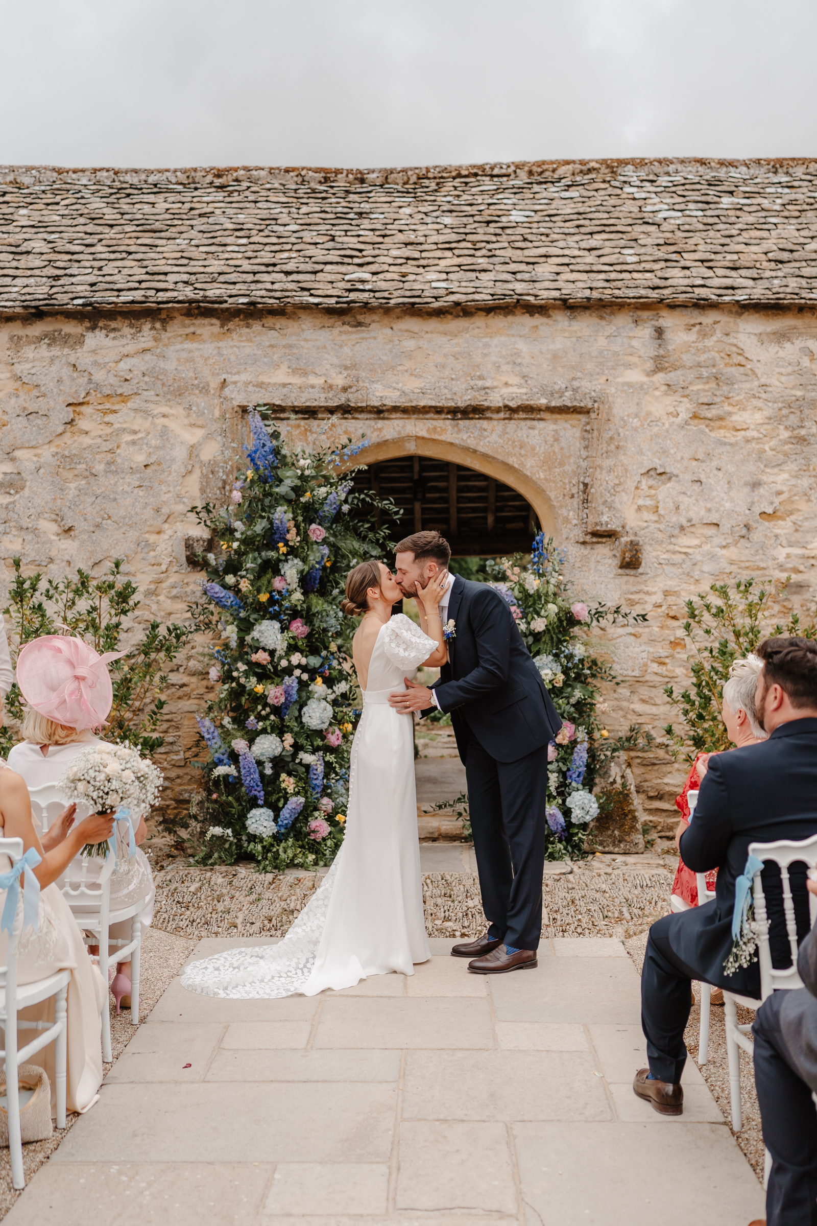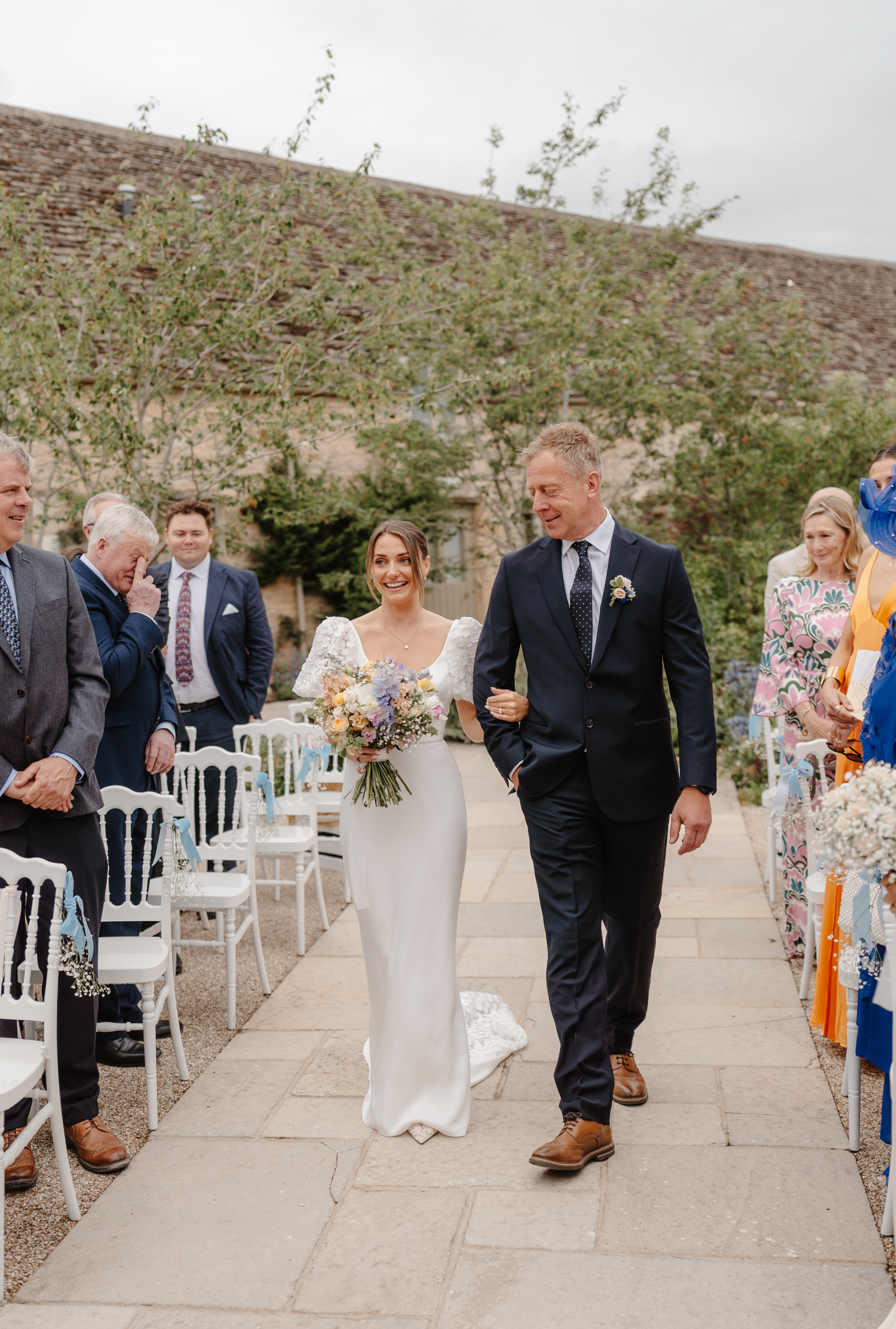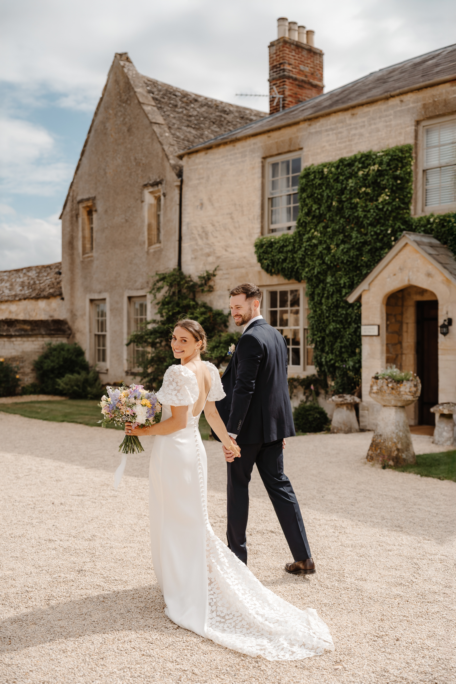 Bethan wore a stunning Sassi Holford ‘Ella’ dress with delicate puff lace sleeves – classic but distinctive in silhouette. Her bridesmaids wore a beautiful mix of pastel tones, each paired with florals in complementary shades – a palette that sat beautifully against the Cotswold stone backdrop.