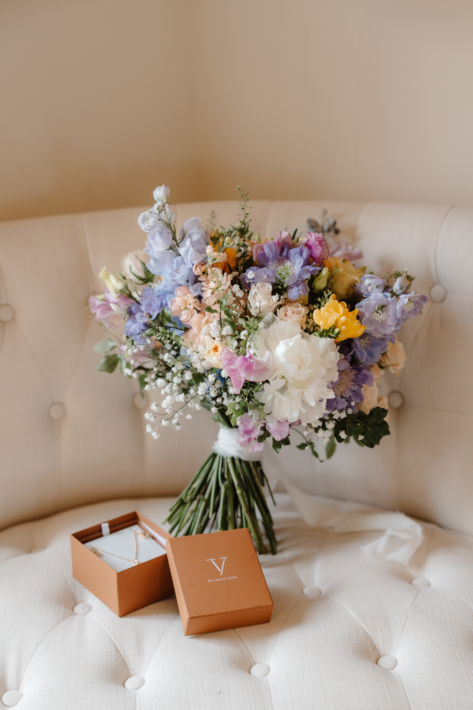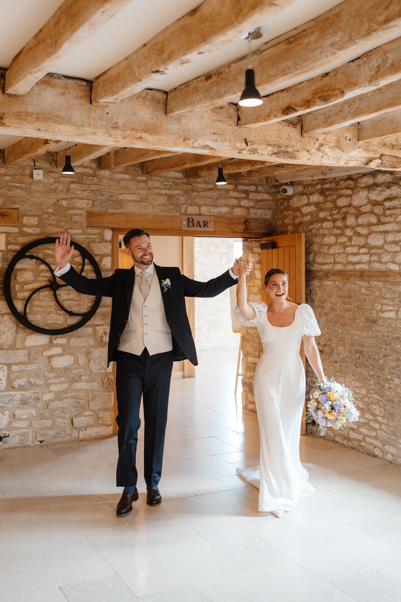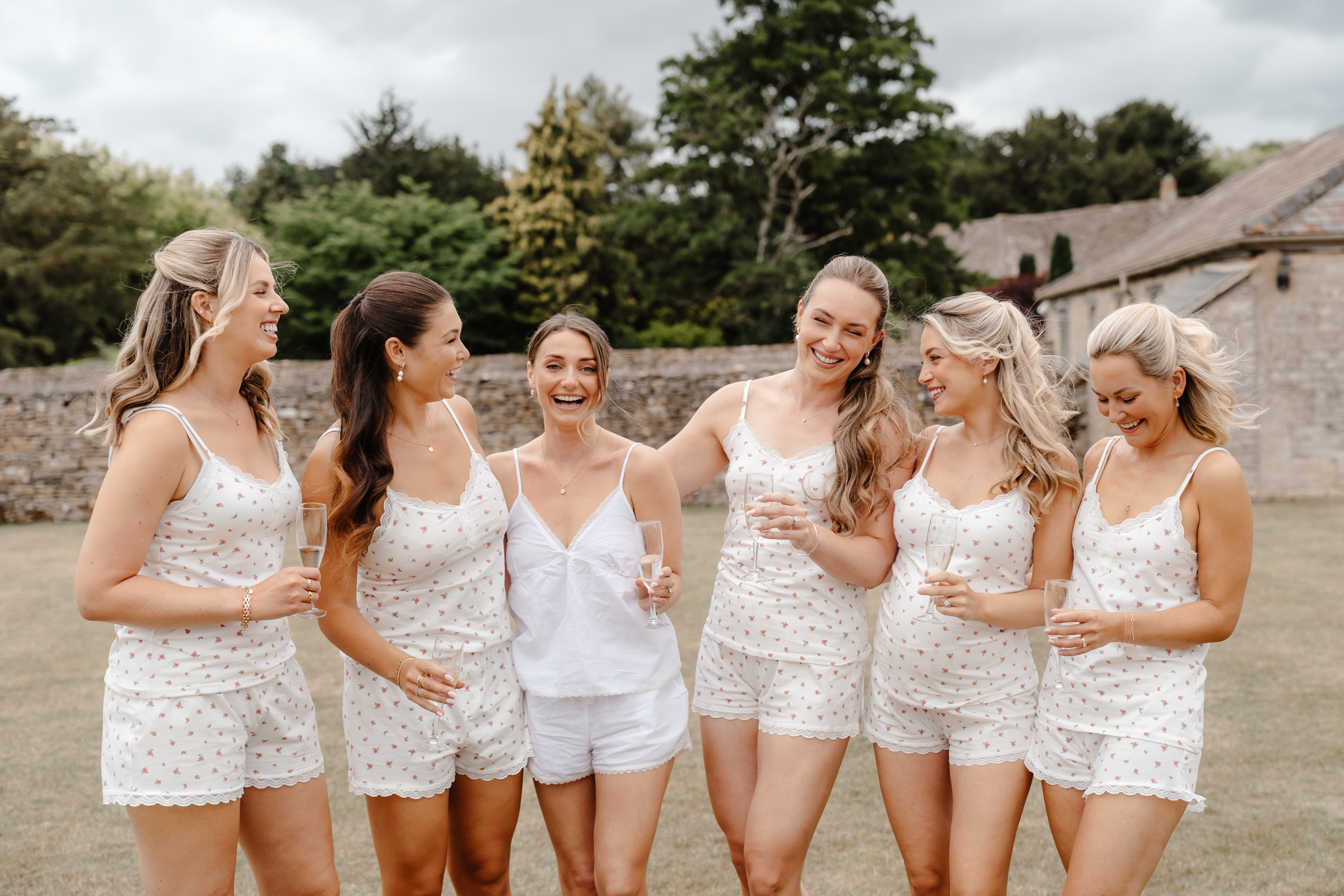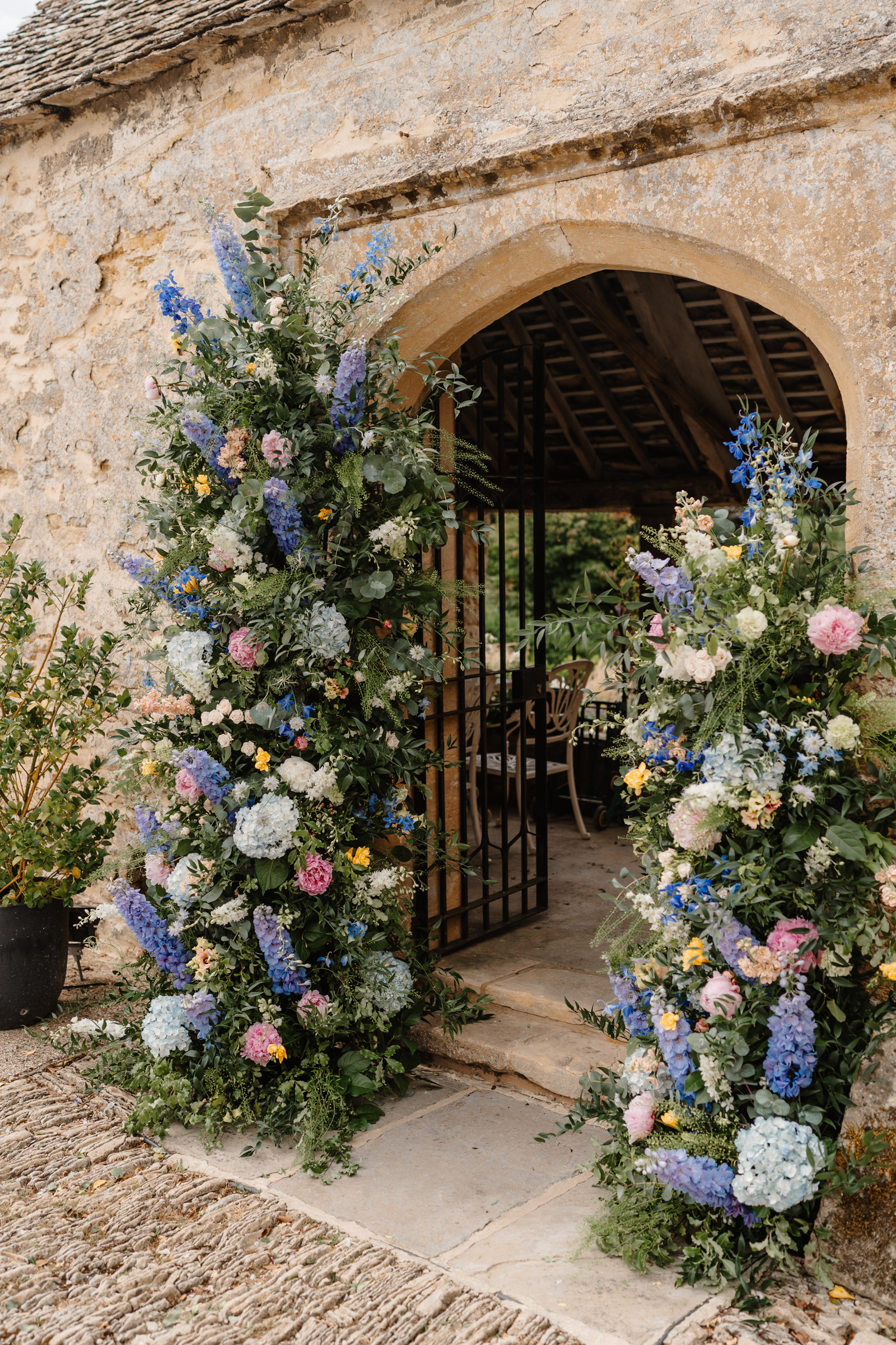 Bethan wore a stunning Sassi Holford ‘Ella’ dress with delicate puff lace sleeves – classic but distinctive in silhouette. Her bridesmaids wore a beautiful mix of pastel tones, each paired with florals in complementary shades – a palette that sat beautifully against the Cotswold stone backdrop.