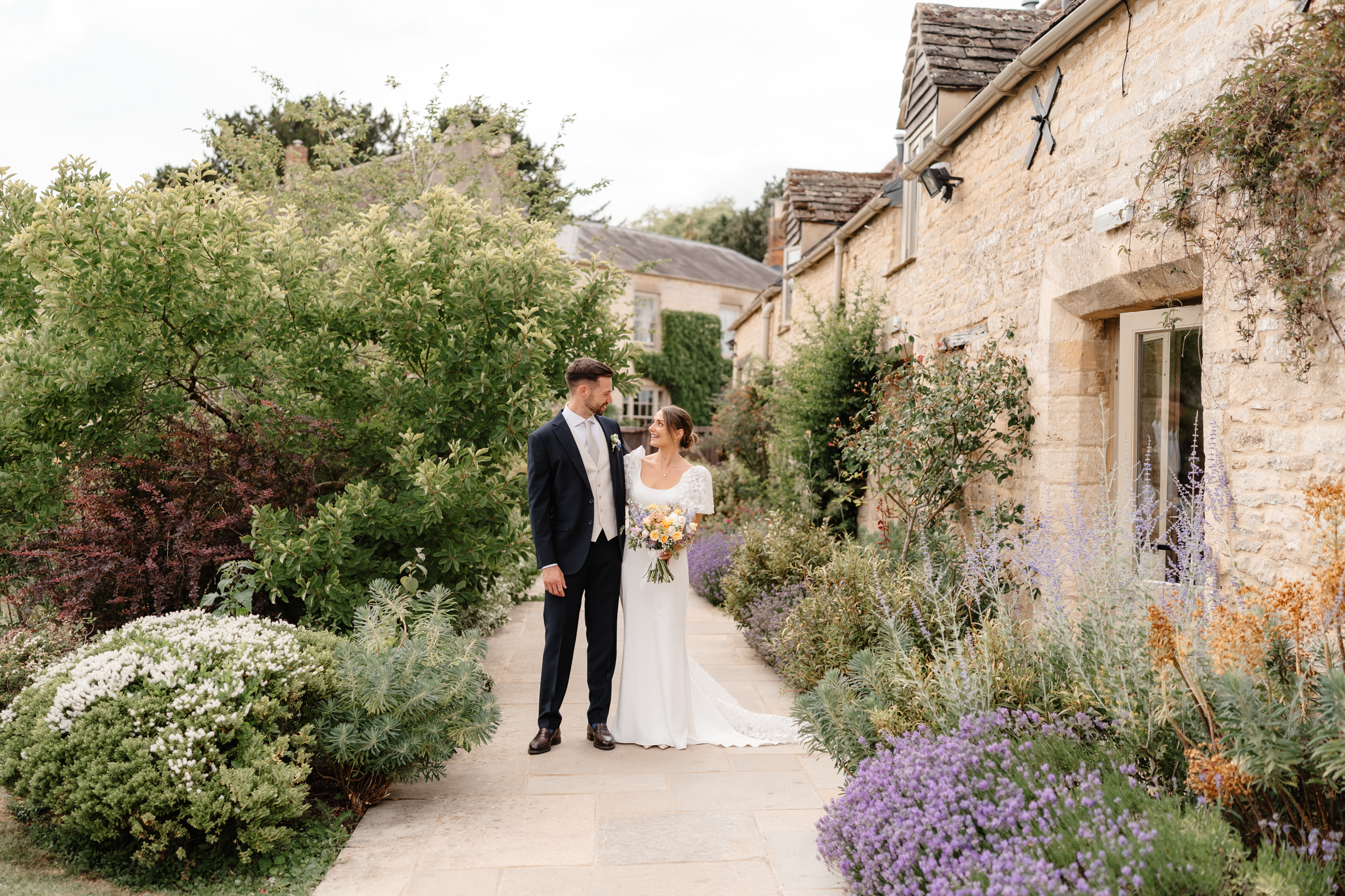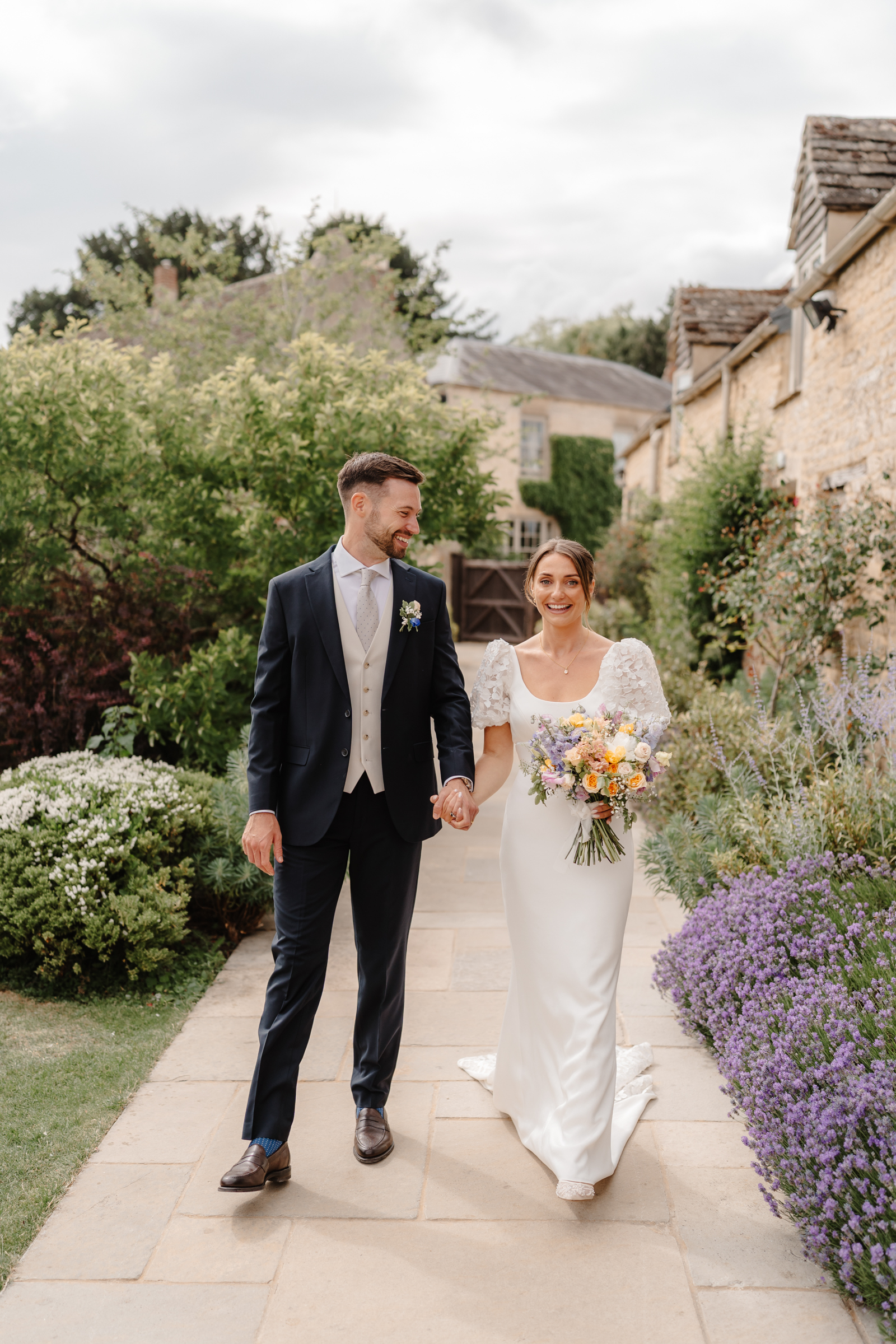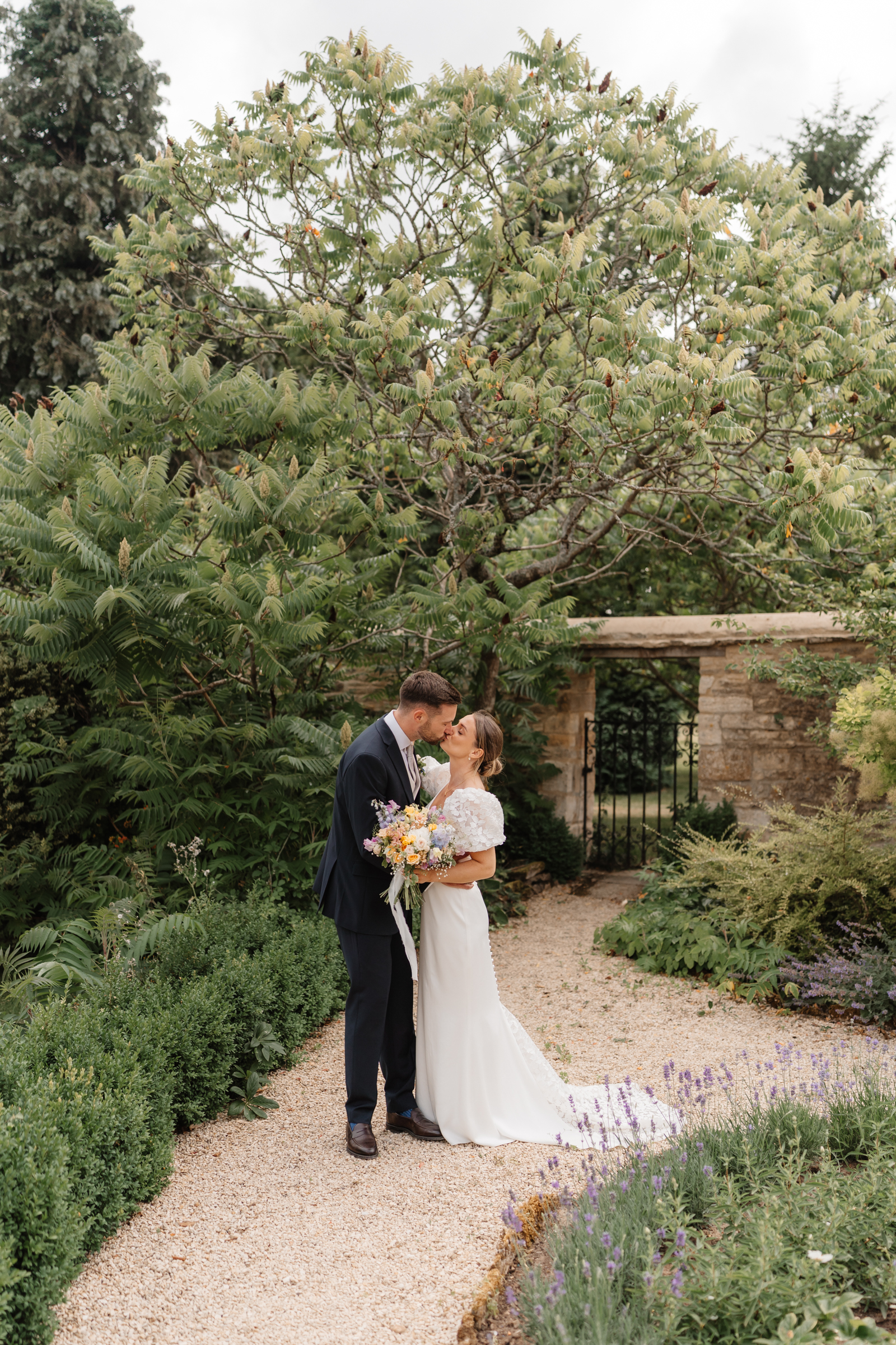 The stone barns, courtyard, gardens and surrounding countryside all sit close together, giving so much choice for couples portraits. We slipped away towards the end of drinks reception to capture a few photographs of just the two of them, making the most of the setting without keeping them from guests for long. One of my favourite spots in June is the purple lavender lined pathway, which sits in full bloom at that time of year – a beautiful, seasonal backdrop that always feels particularly special to photograph.