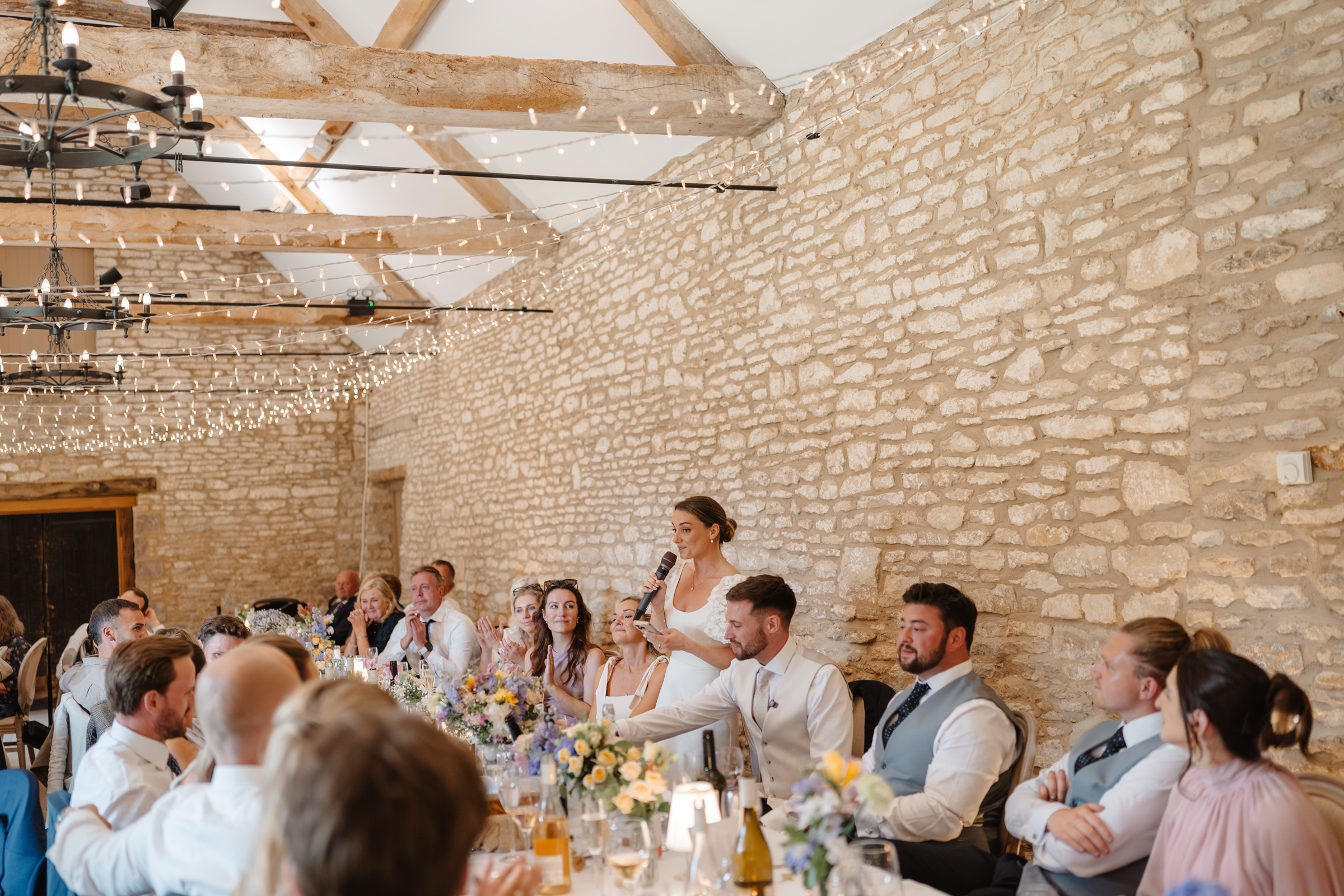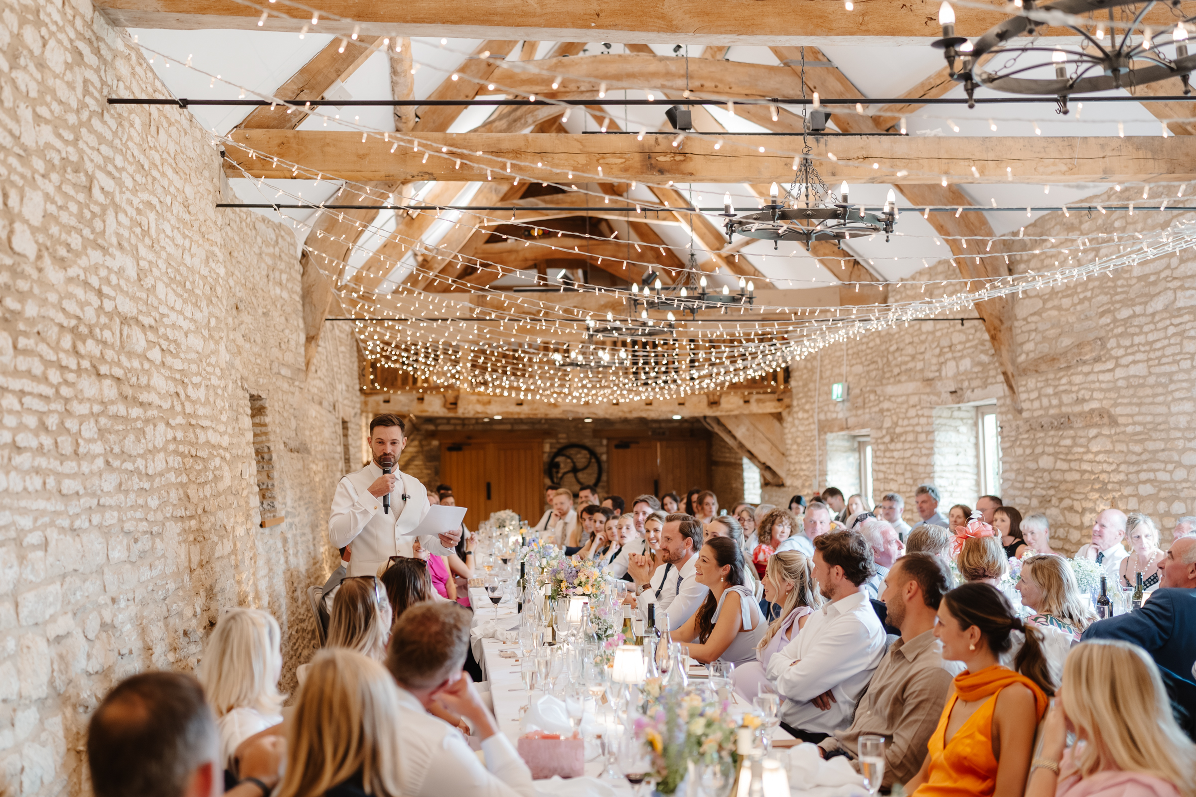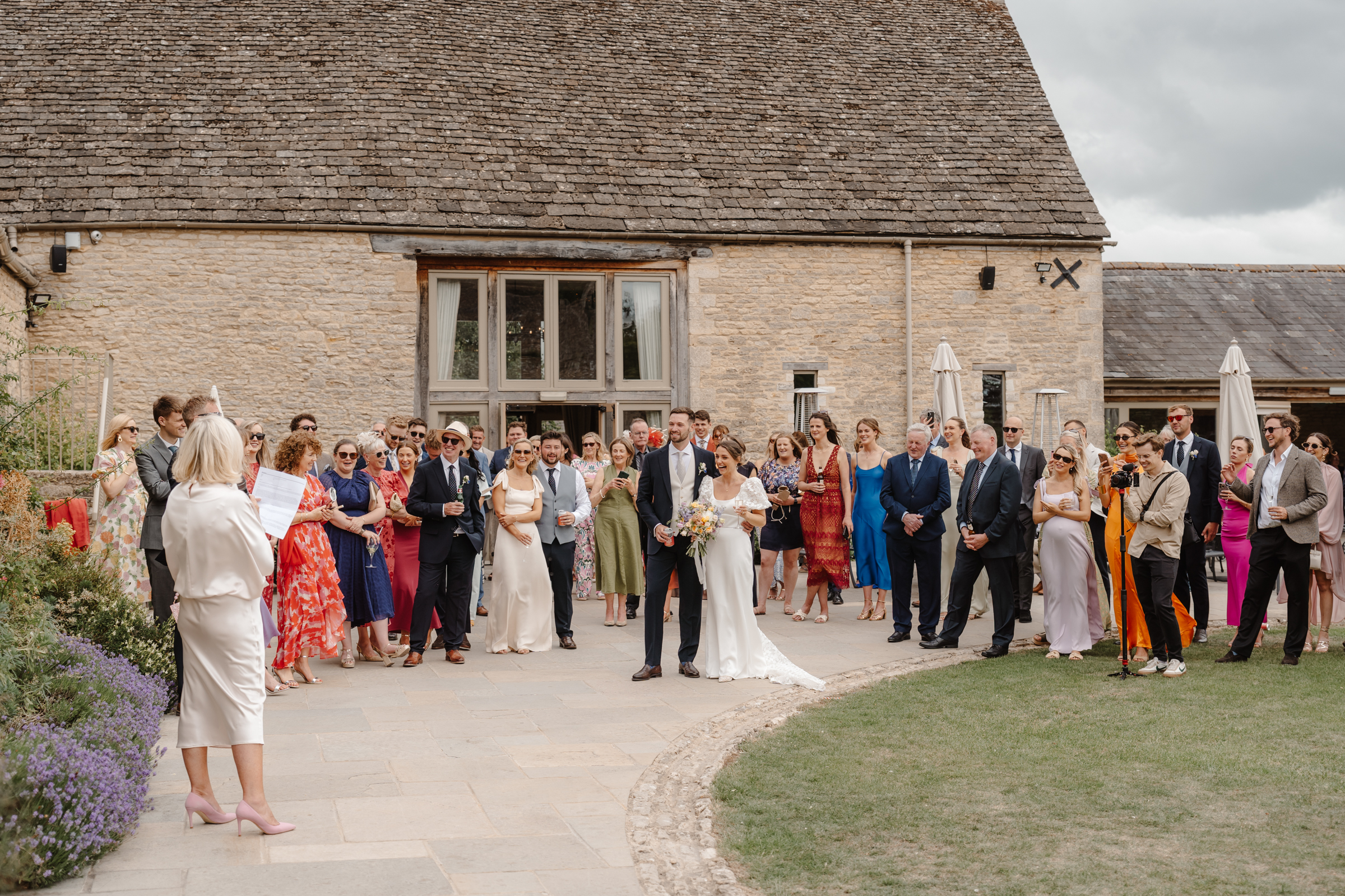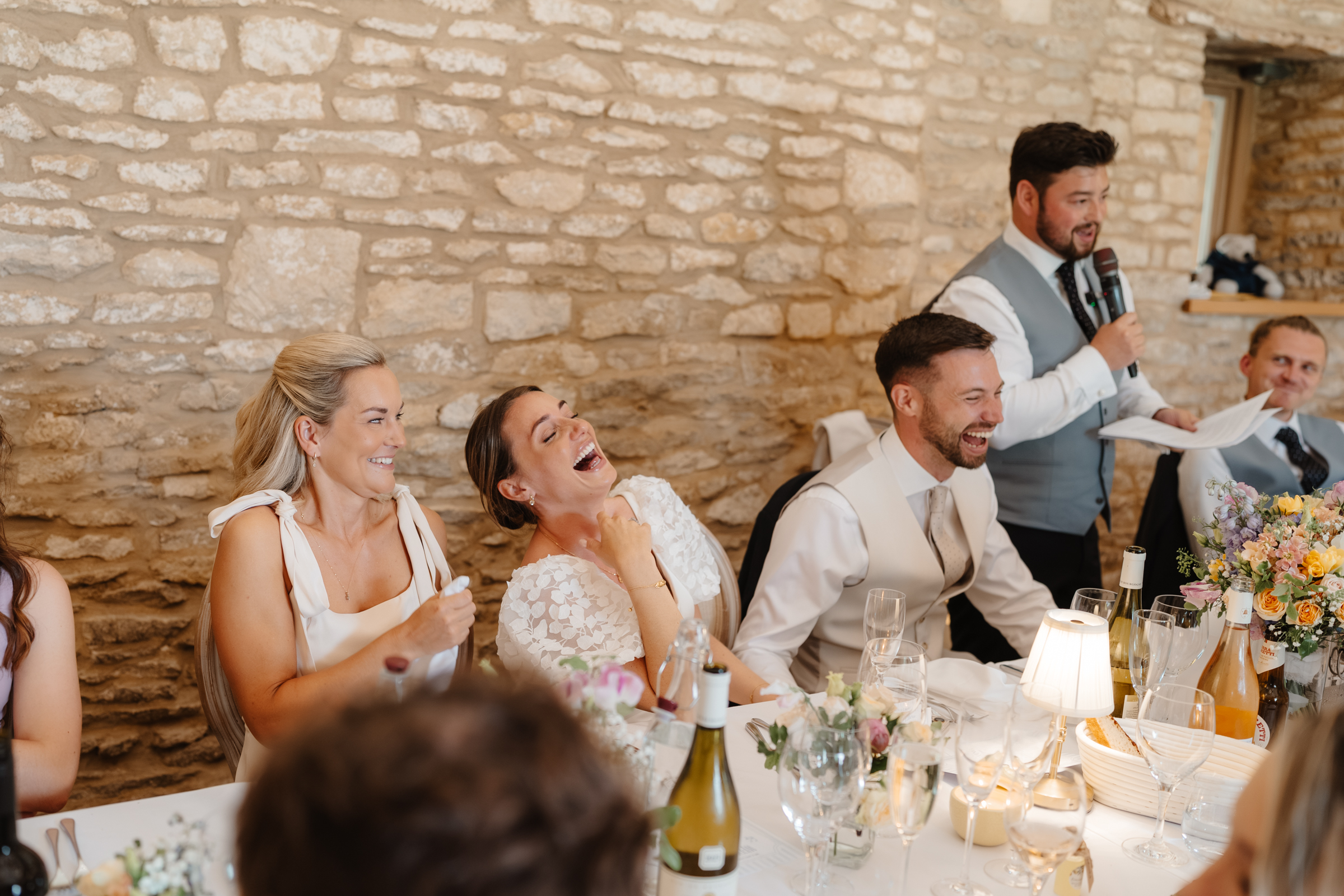 The rain cleared quickly, allowing guests to enjoy a relaxed drinks reception on the patio overlooking Caswell’s gardens. To close this part of the afternoon, they chose to hold their first speech outdoors – one of my absolute favourite, less traditional moments to capture during drinks reception. I love outdoor speeches in summer and there is always something so relaxed about them. Guests gathered naturally, drinks in hand and the atmosphere felt informal and easy – completely in keeping with the theme of the day.