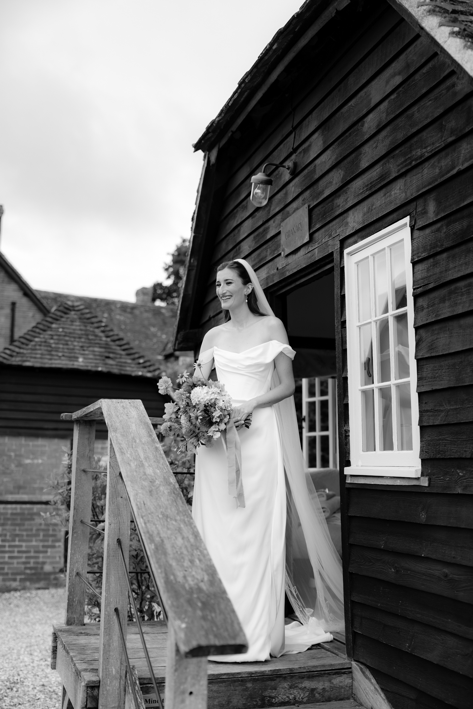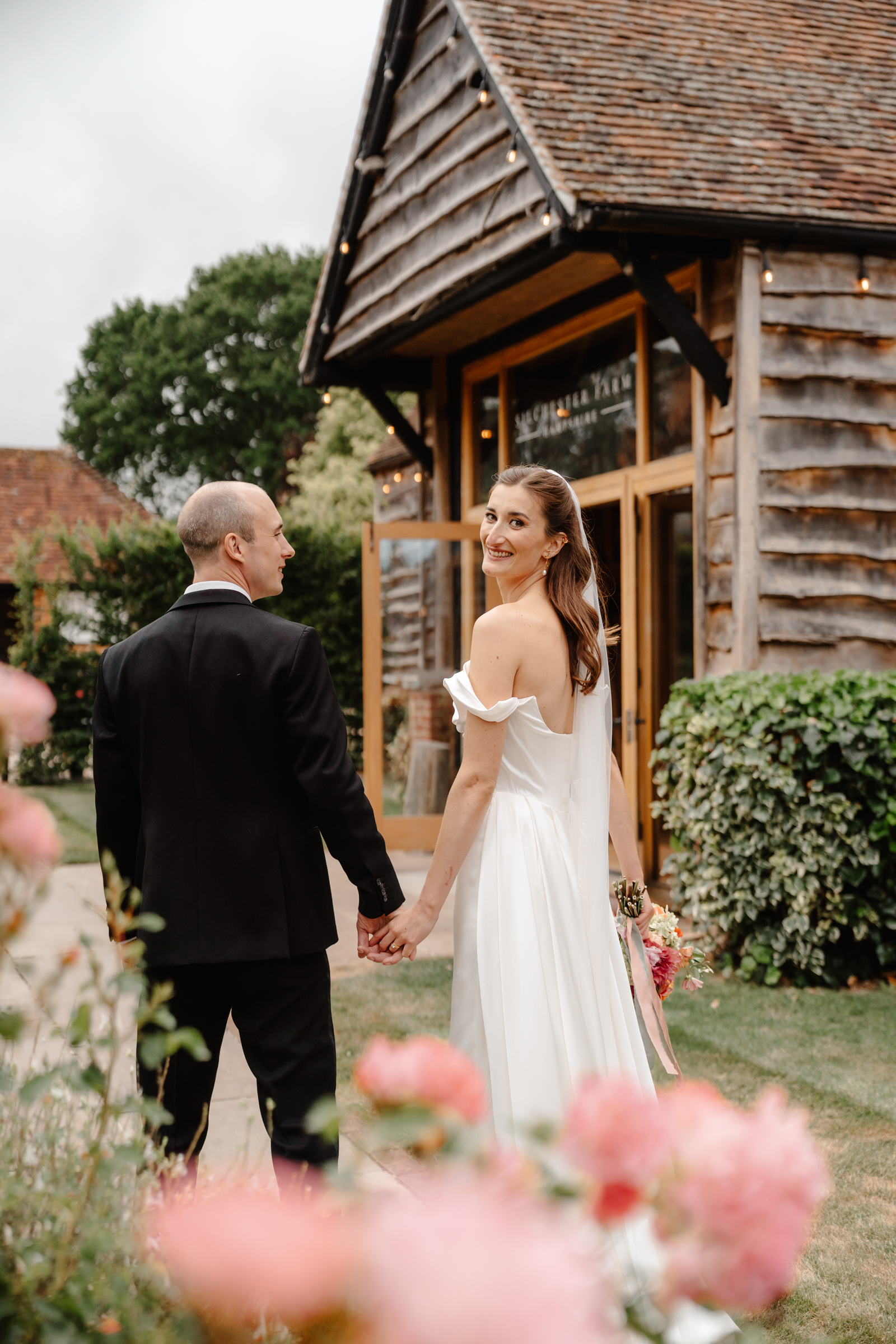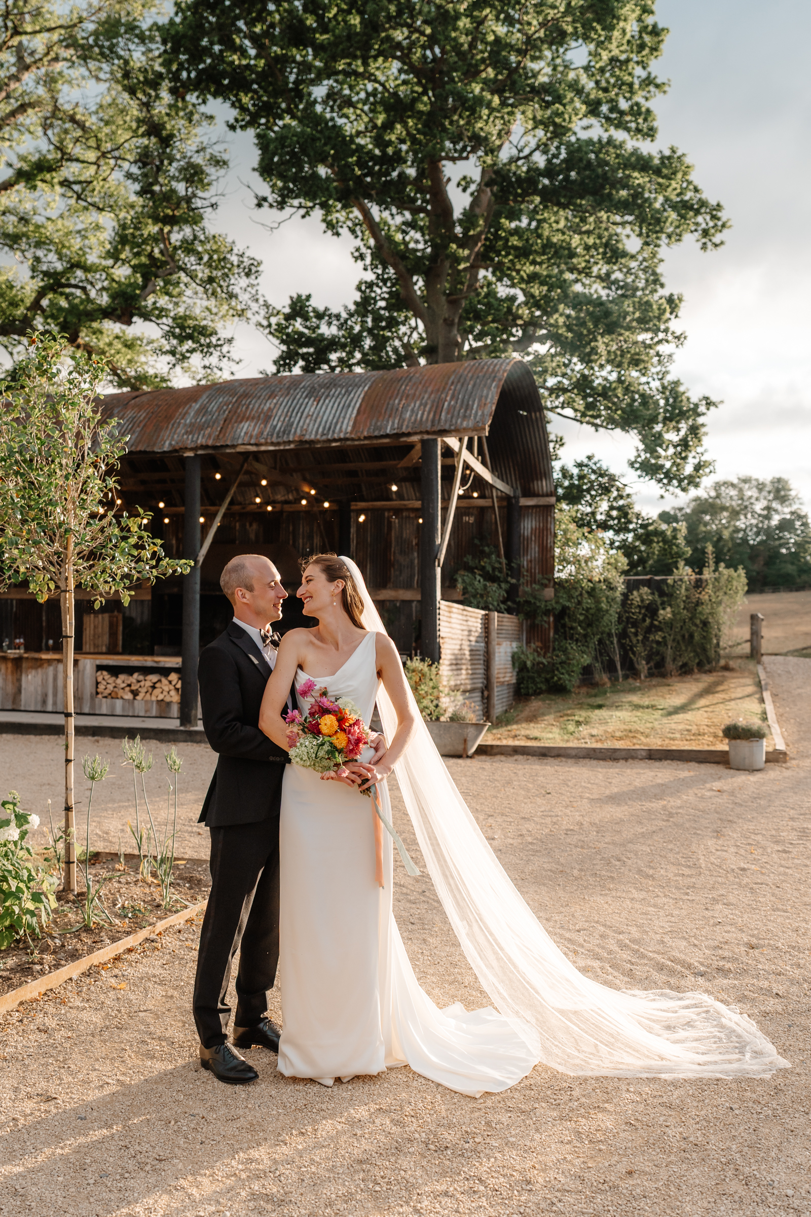 With both Sarah and Huw getting ready on site, the morning unfolded in a wonderfully relaxed way, allowing plenty of time to soak up the atmosphere. Sarah wore the iconic Vivienne Westwood ‘Nova Grace’ gown, paired with a half overskirt, veil and Manolo Blahnik heels. Their colour scheme echoed their Marylebone Town Hall florals, with bursts of bright pink and orange woven throughout – bringing a beautiful sense of colour and vibrancy into the barn spaces.