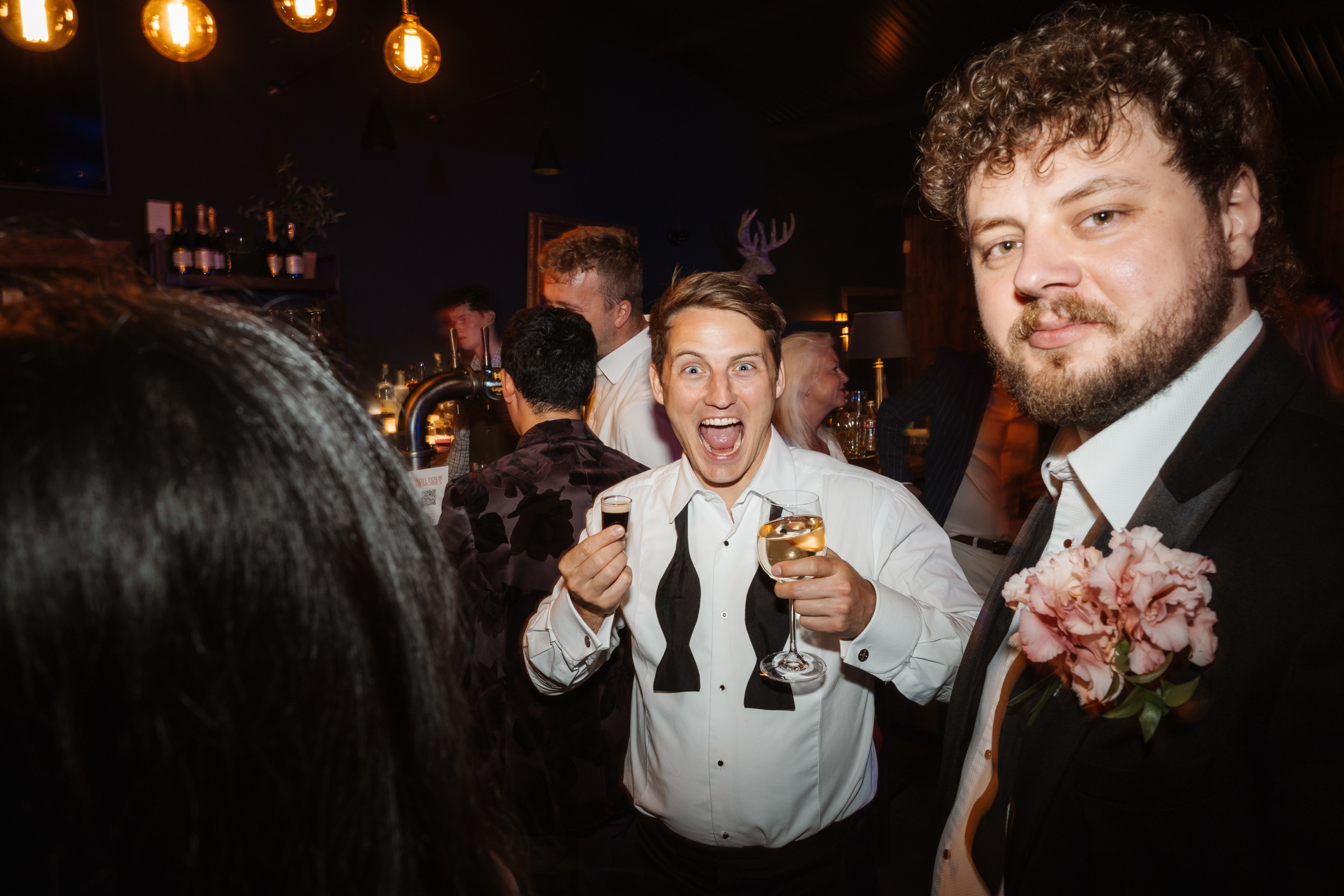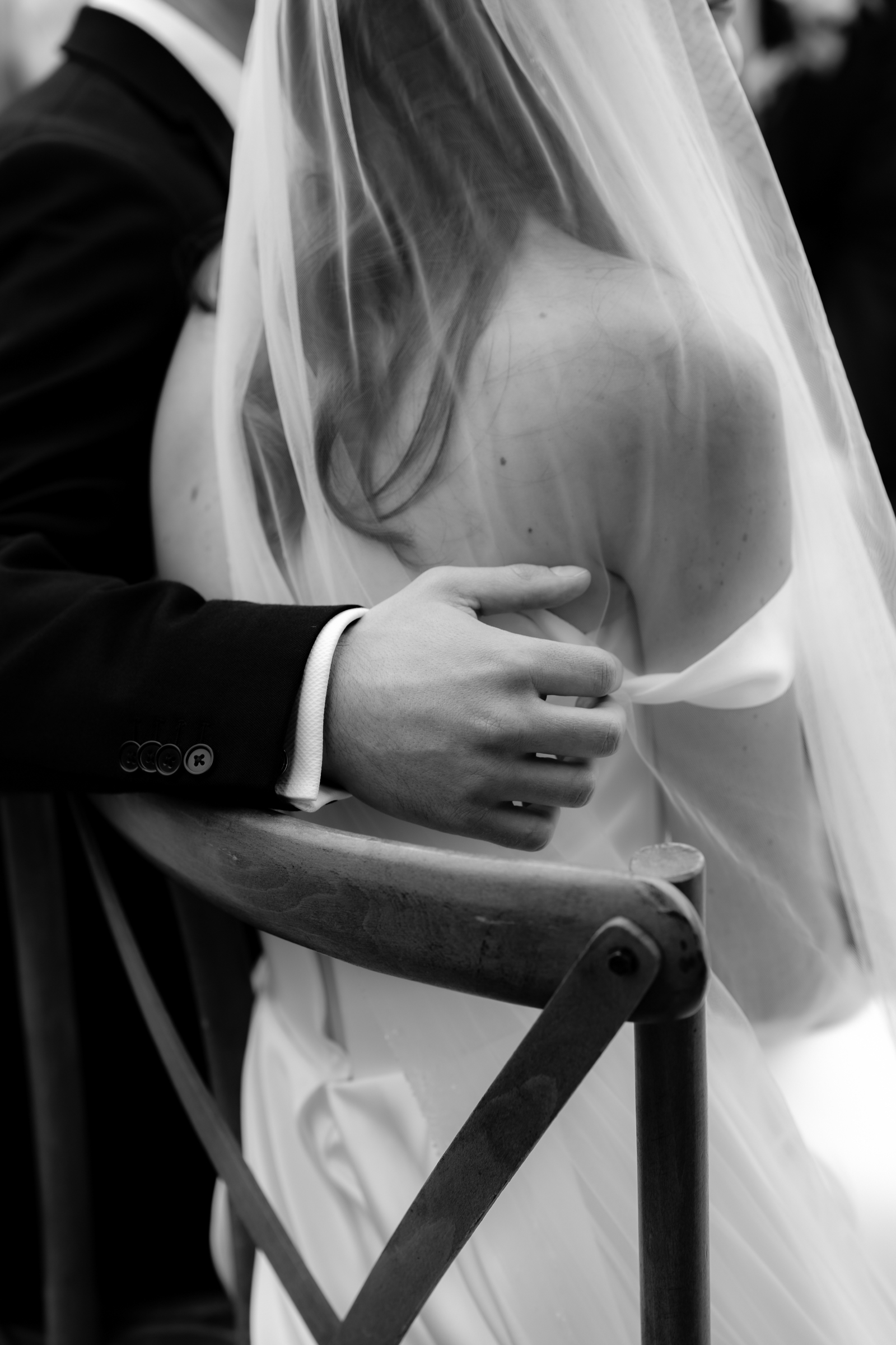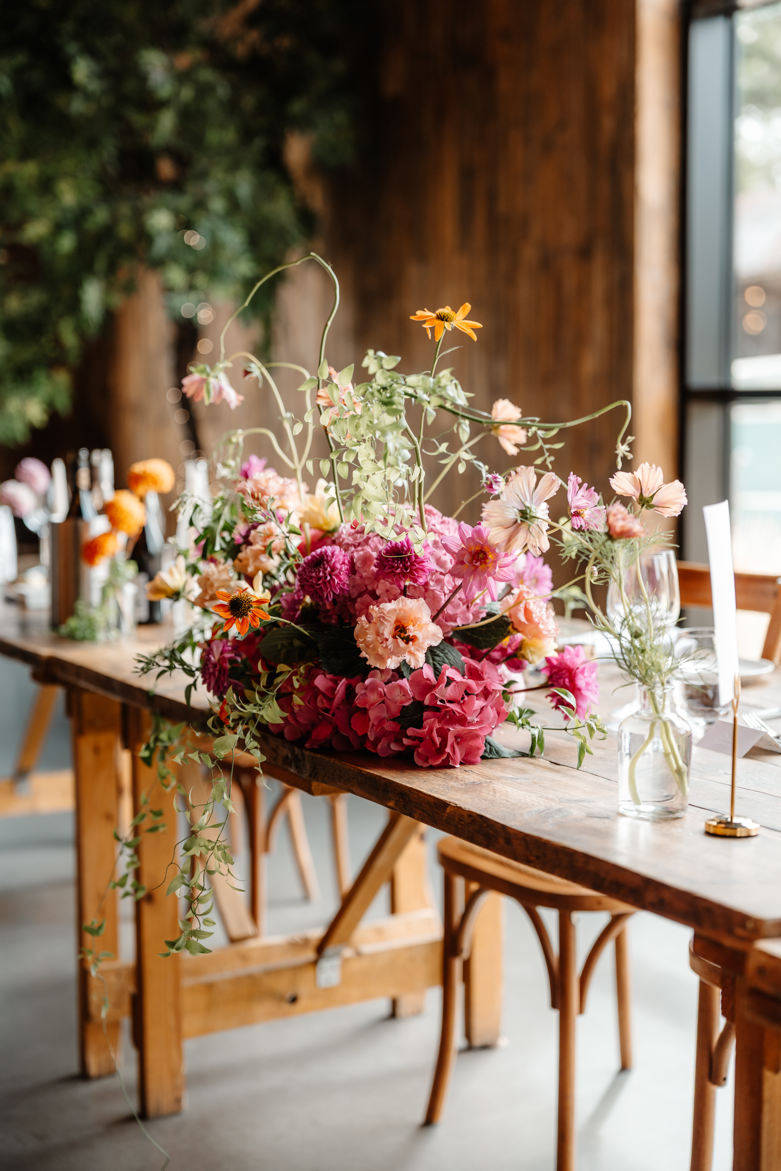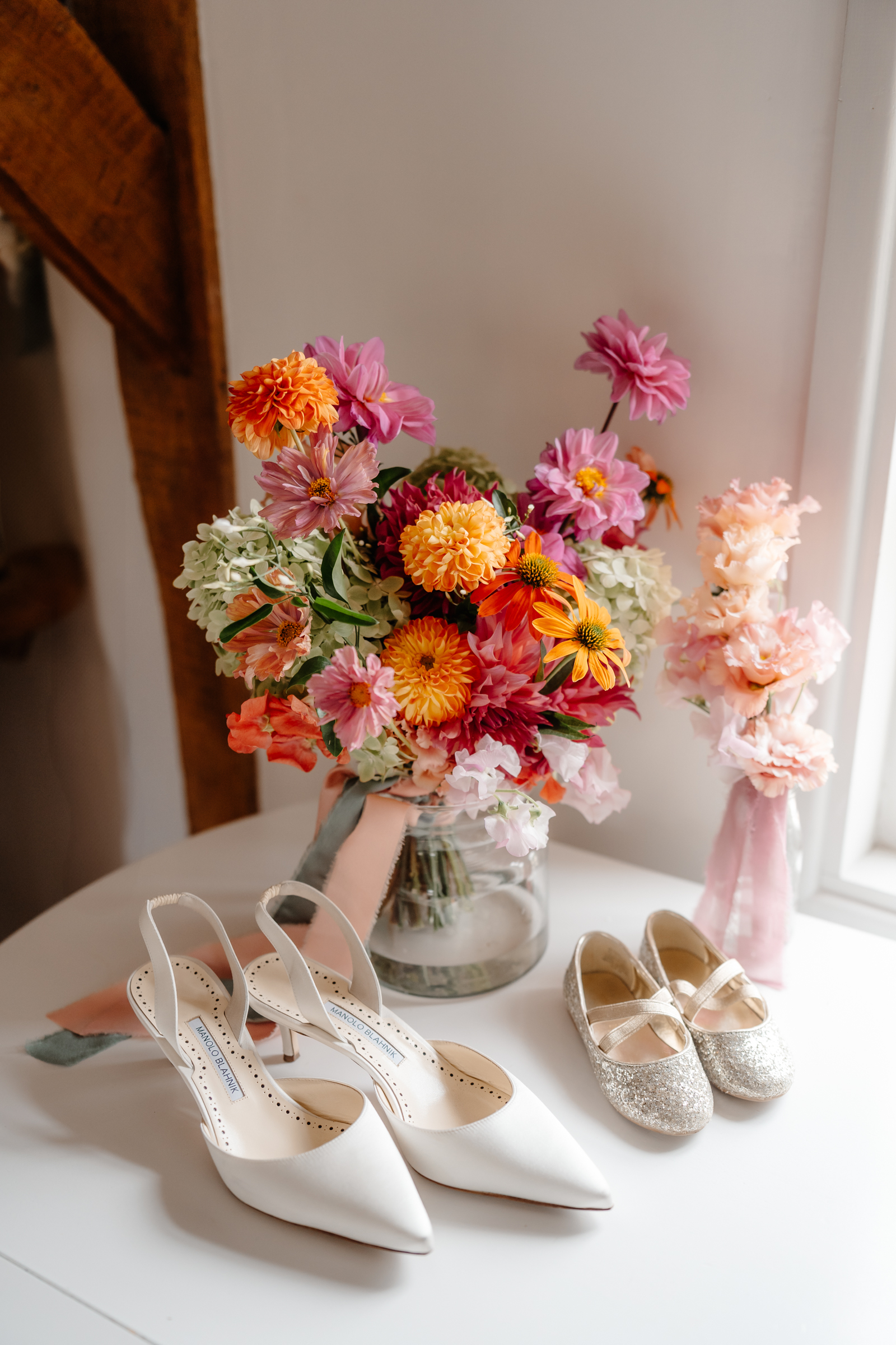 With both Sarah and Huw getting ready on site, the morning unfolded in a wonderfully relaxed way, allowing plenty of time to soak up the atmosphere. Sarah wore the iconic Vivienne Westwood ‘Nova Grace’ gown, paired with a half overskirt, veil and Manolo Blahnik heels. Their colour scheme echoed their Marylebone Town Hall florals, with bursts of bright pink and orange woven throughout – bringing a beautiful sense of colour and vibrancy into the barn spaces.