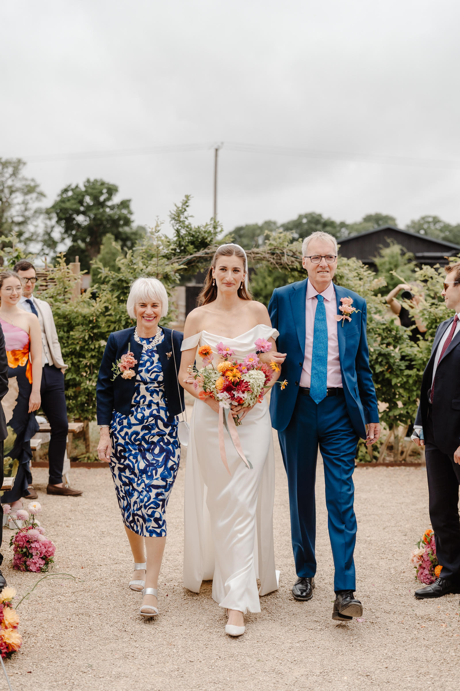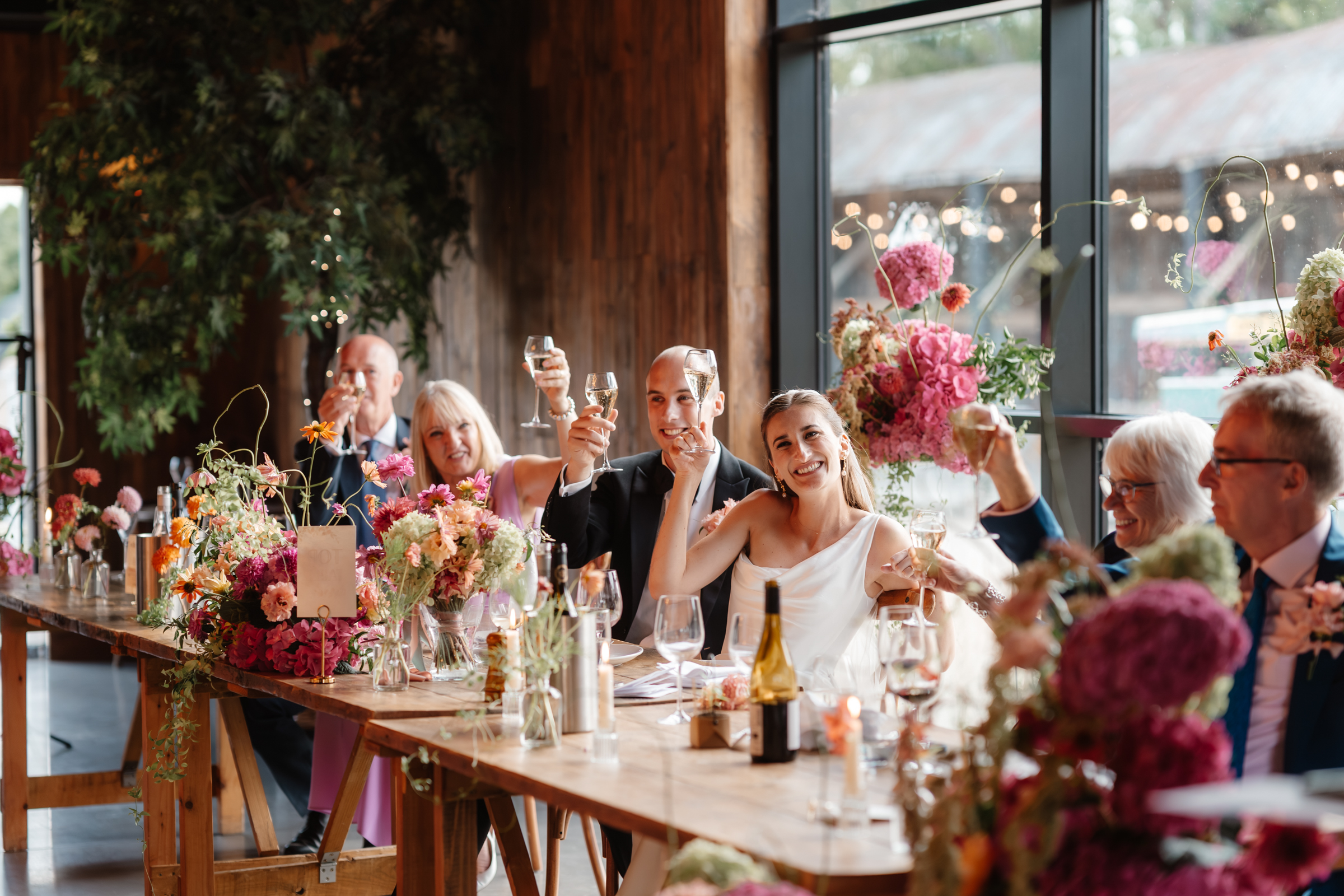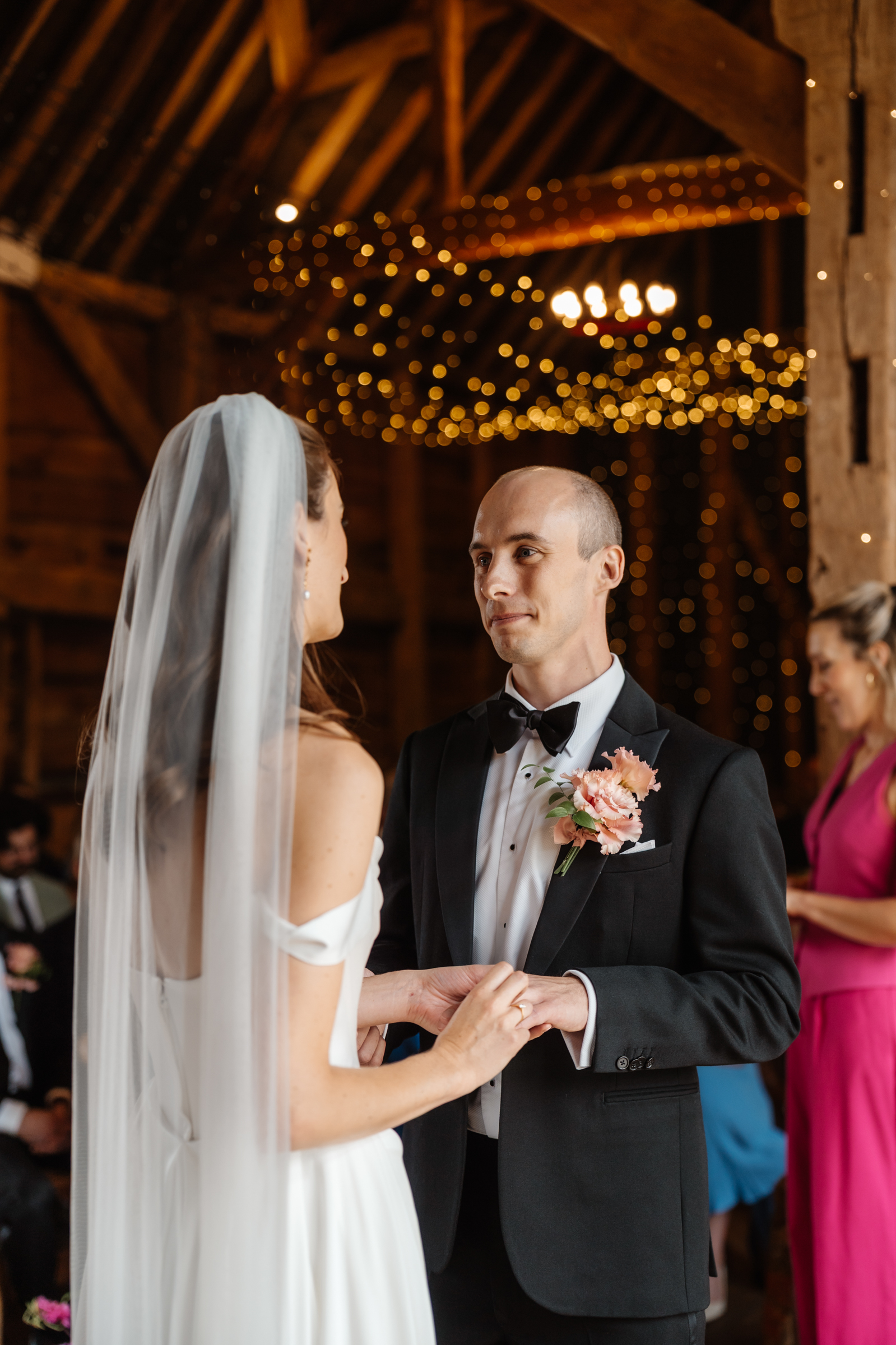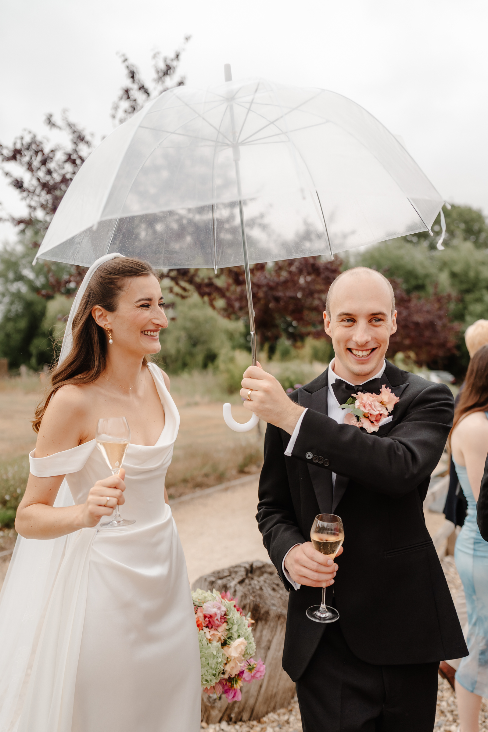 One of the real benefits of a celebrant ceremony is how personal it can be. Sarah Clark had clearly spent time getting to know them both and the ceremony felt entirely their own. It was thoughtful, relaxed and full of meaningful touches you simply don’t get in a standard script. Another advantage of a celebrant-led ceremony is flexibility! When the heavens opened and the rain began to fall, Sarah made the quick call to move everyone indoors (already set up just in case). What followed was such a fun, spontaneous moment – guests grabbed umbrellas and armfuls of ceremony florals, as they made a dash for the barn. Within minutes everyone was inside, flowers included and the ceremony picked up right where it left off.
