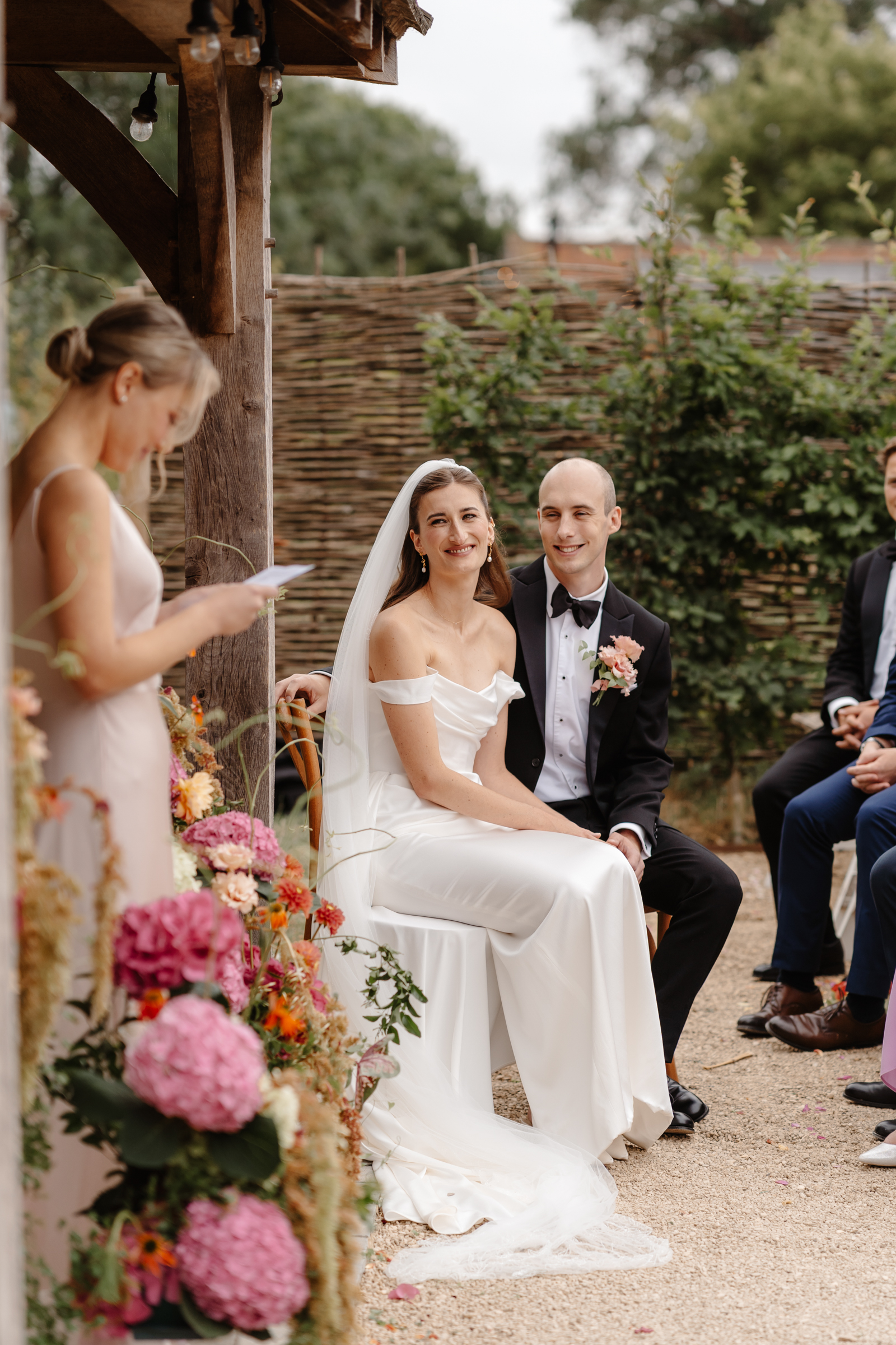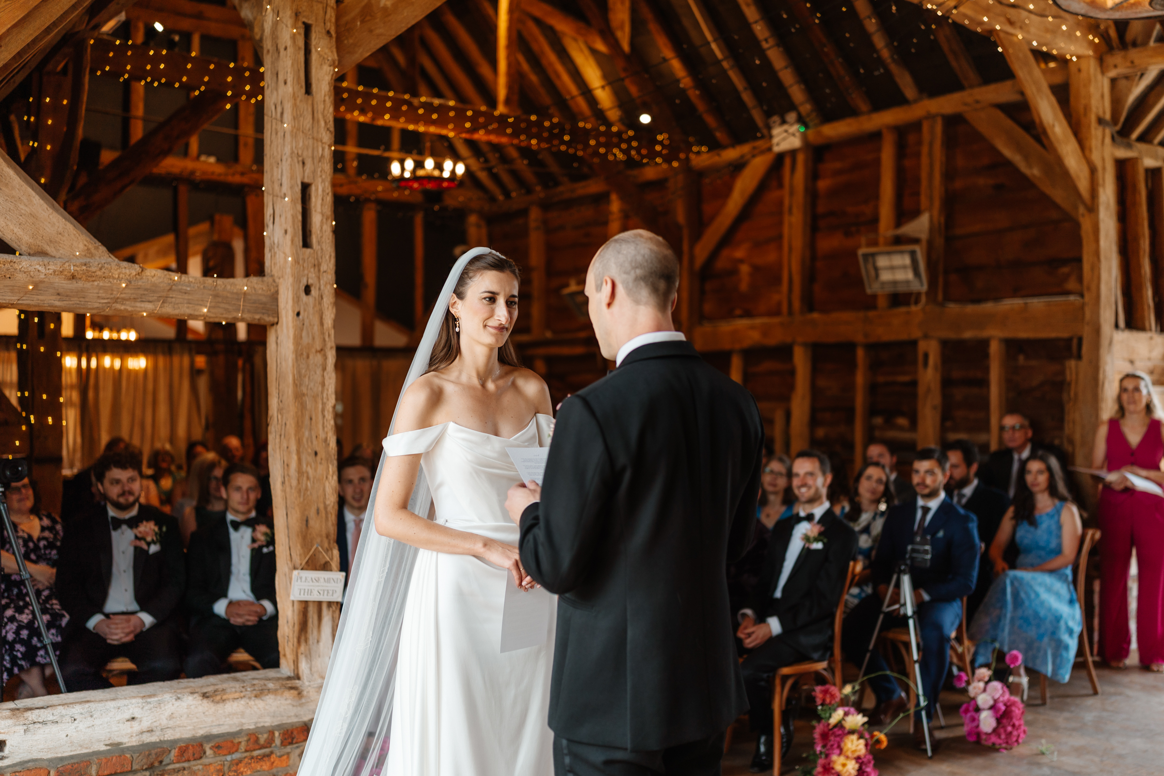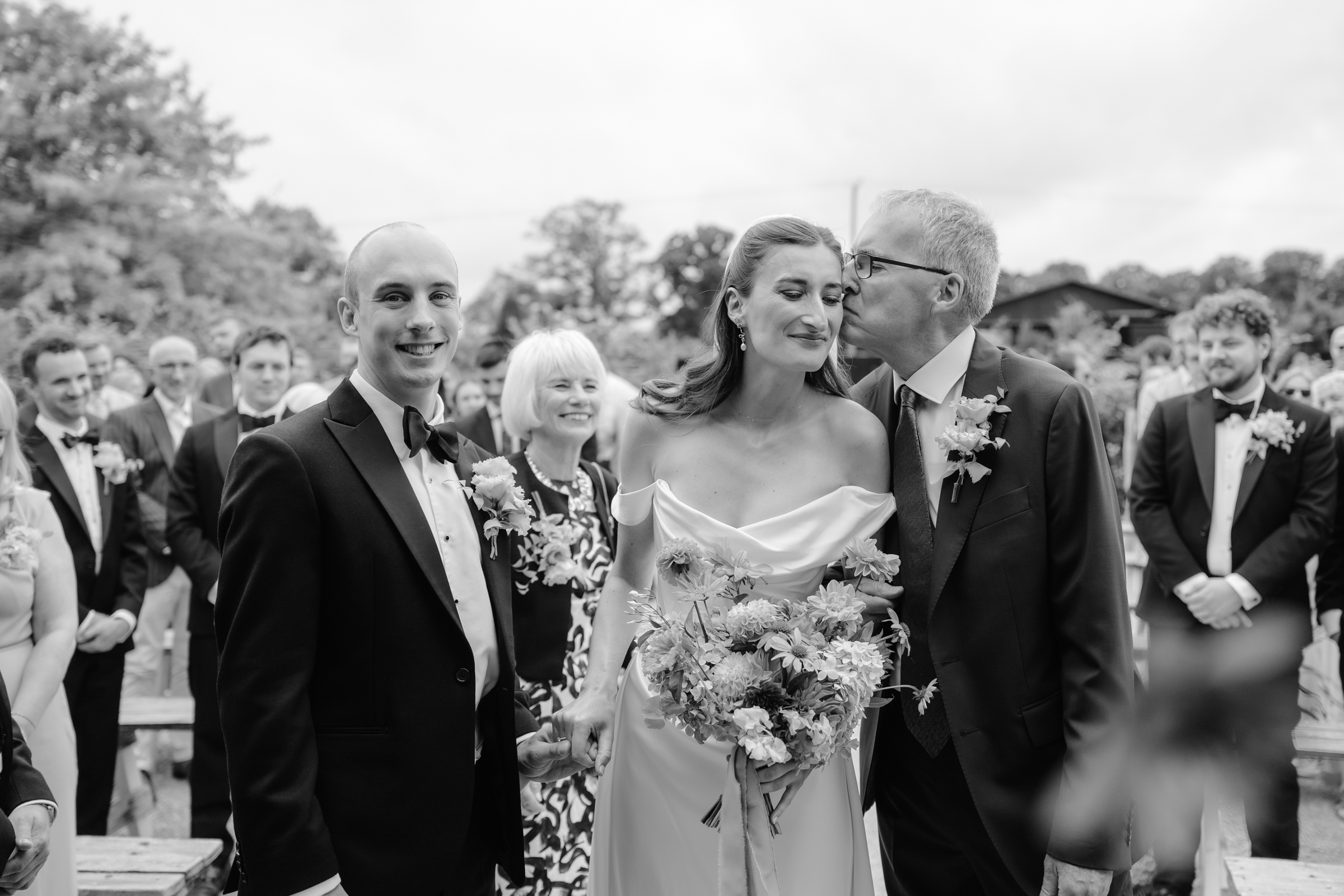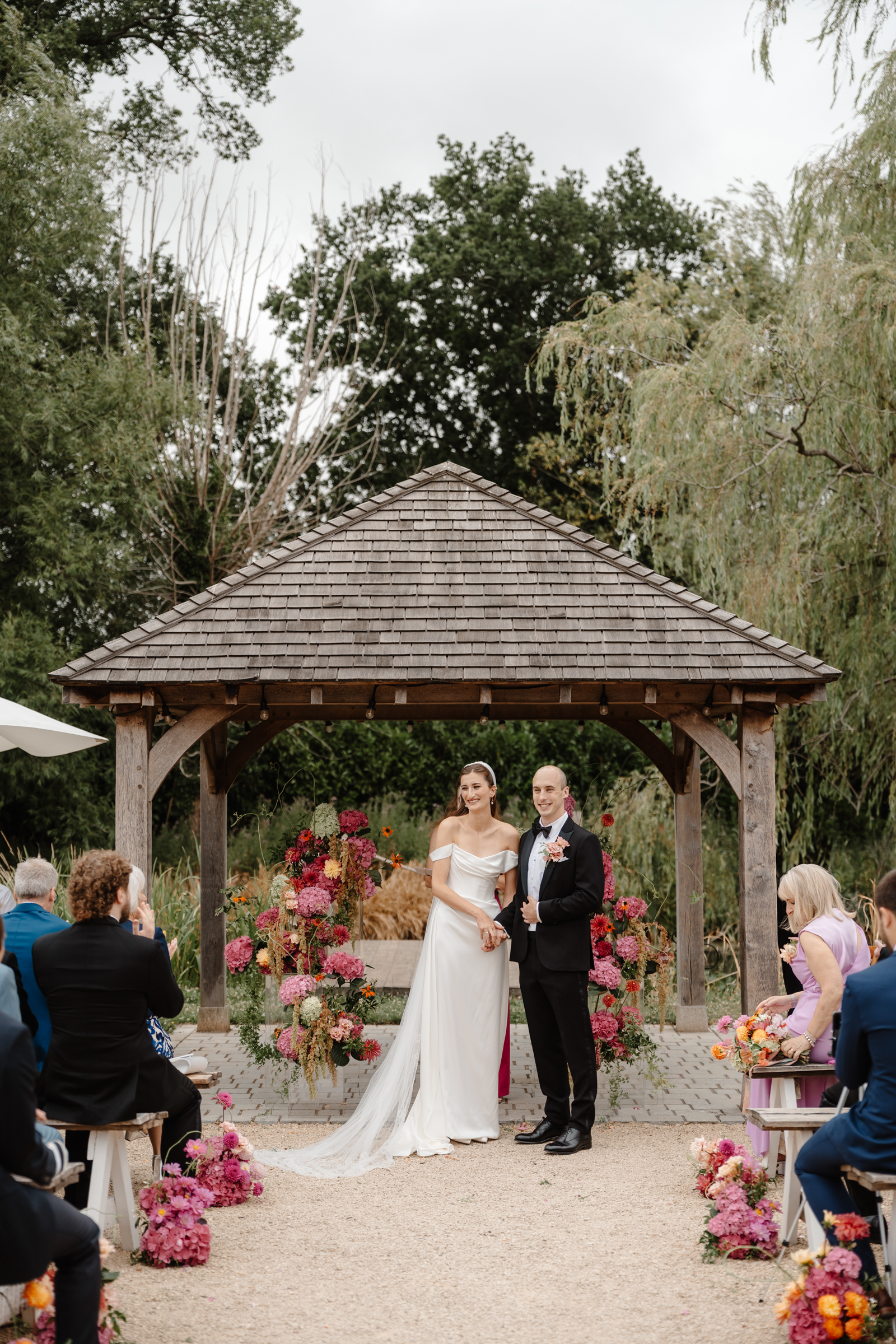 One of the real benefits of a celebrant ceremony is how personal it can be. Sarah Clark had clearly spent time getting to know them both and the ceremony felt entirely their own. It was thoughtful, relaxed and full of meaningful touches you simply don’t get in a standard script. Another advantage of a celebrant-led ceremony is flexibility! When the heavens opened and the rain began to fall, Sarah made the quick call to move everyone indoors (already set up just in case). What followed was such a fun, spontaneous moment – guests grabbed umbrellas and armfuls of ceremony florals, as they made a dash for the barn. Within minutes everyone was inside, flowers included and the ceremony picked up right where it left off.