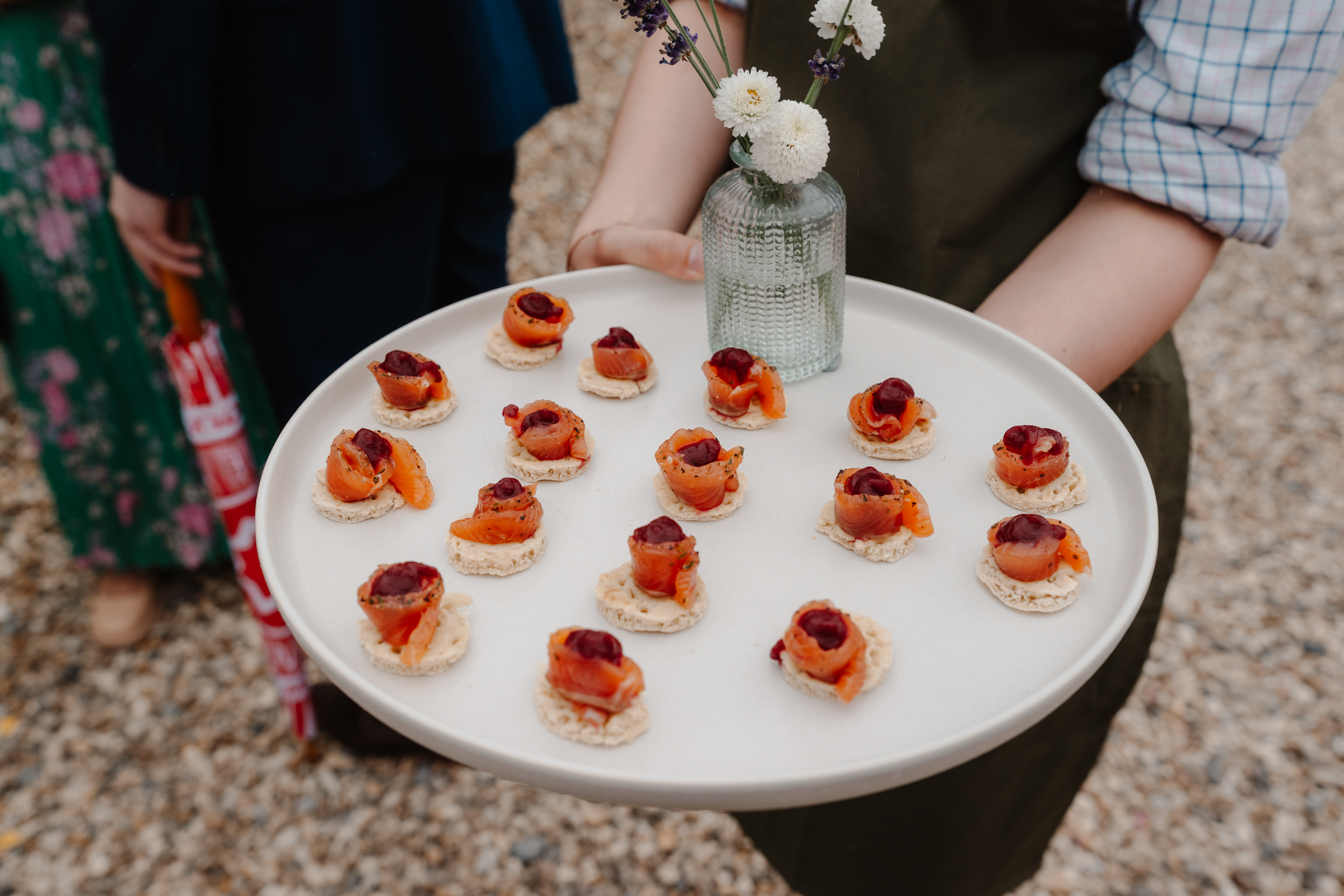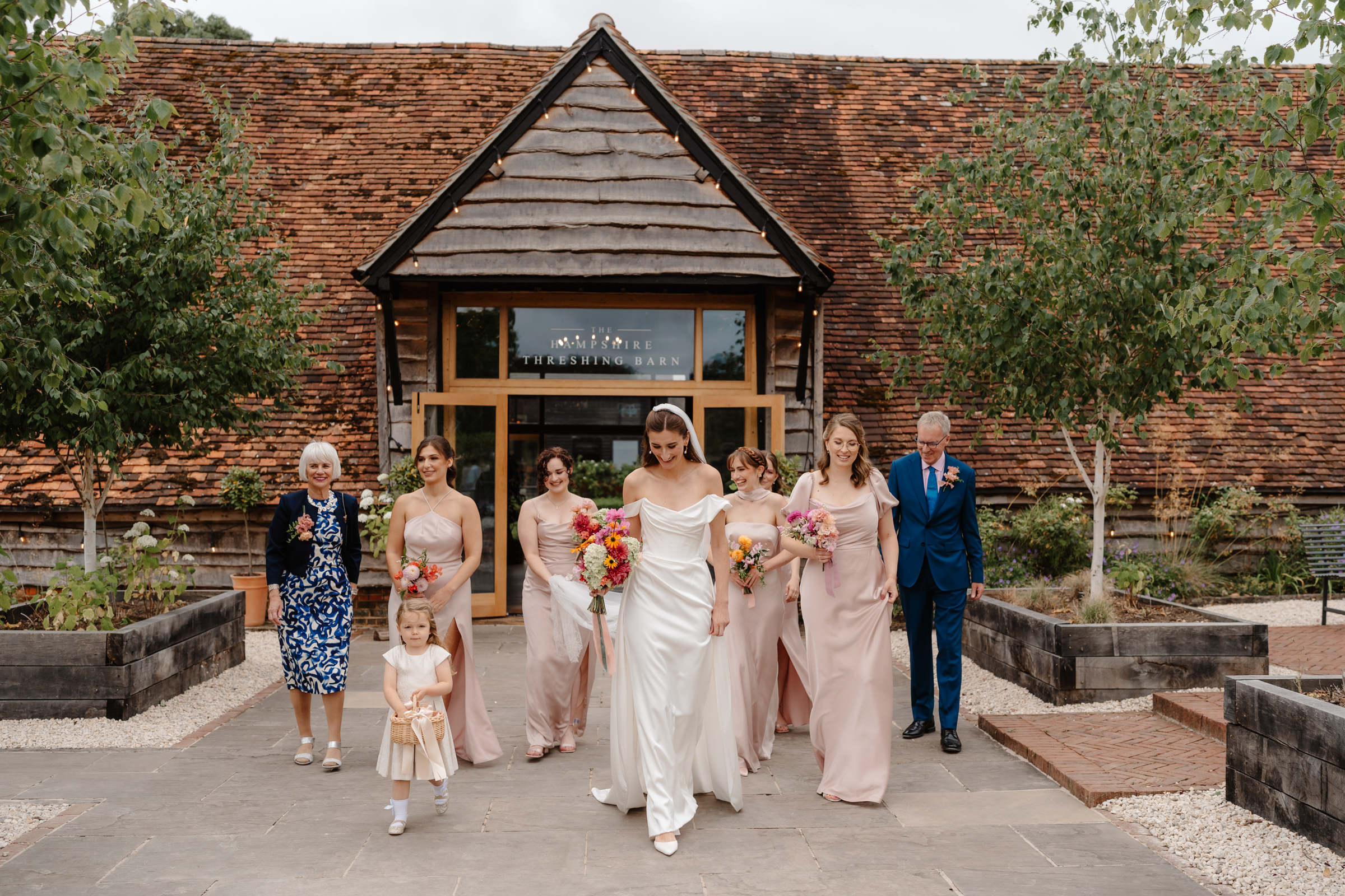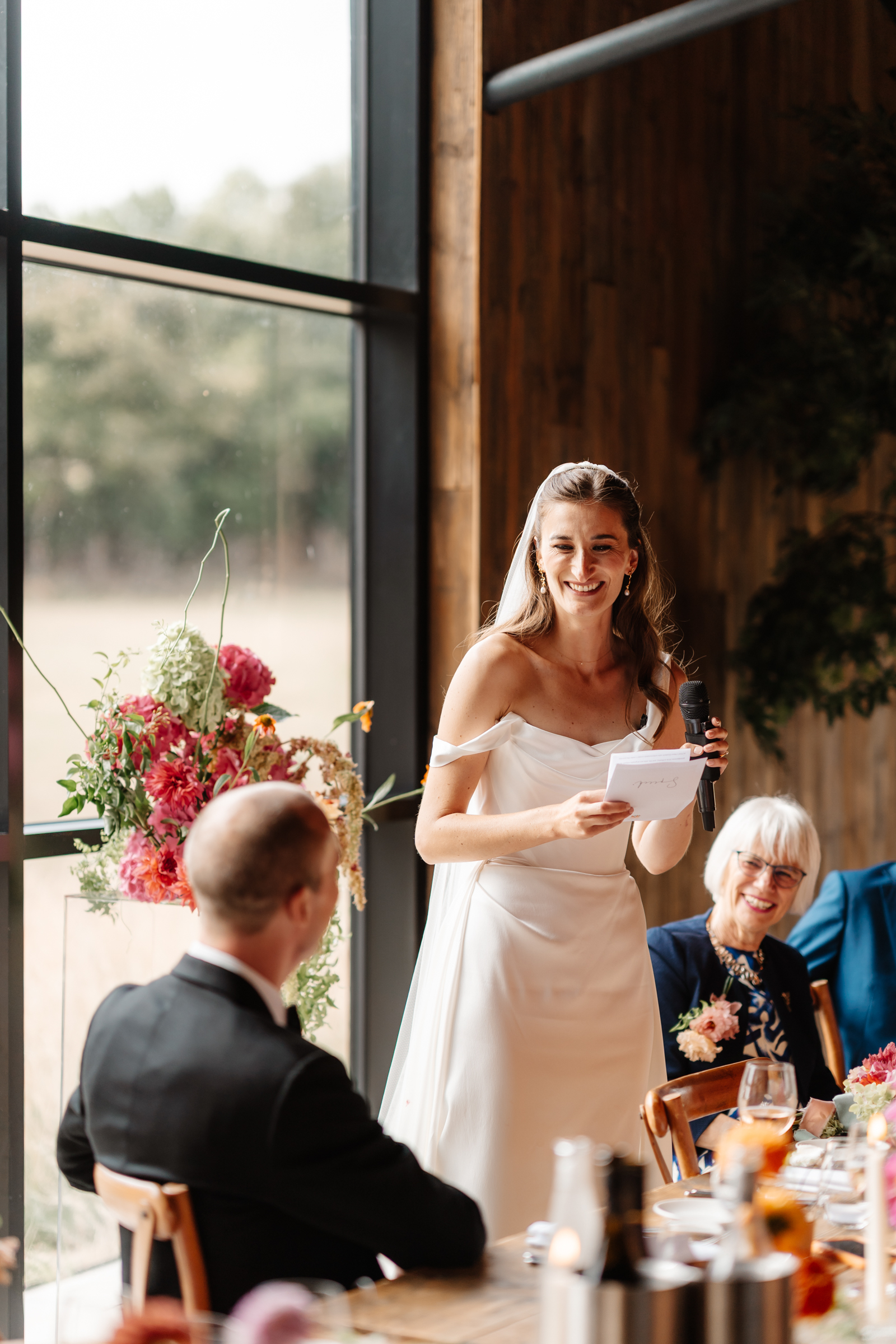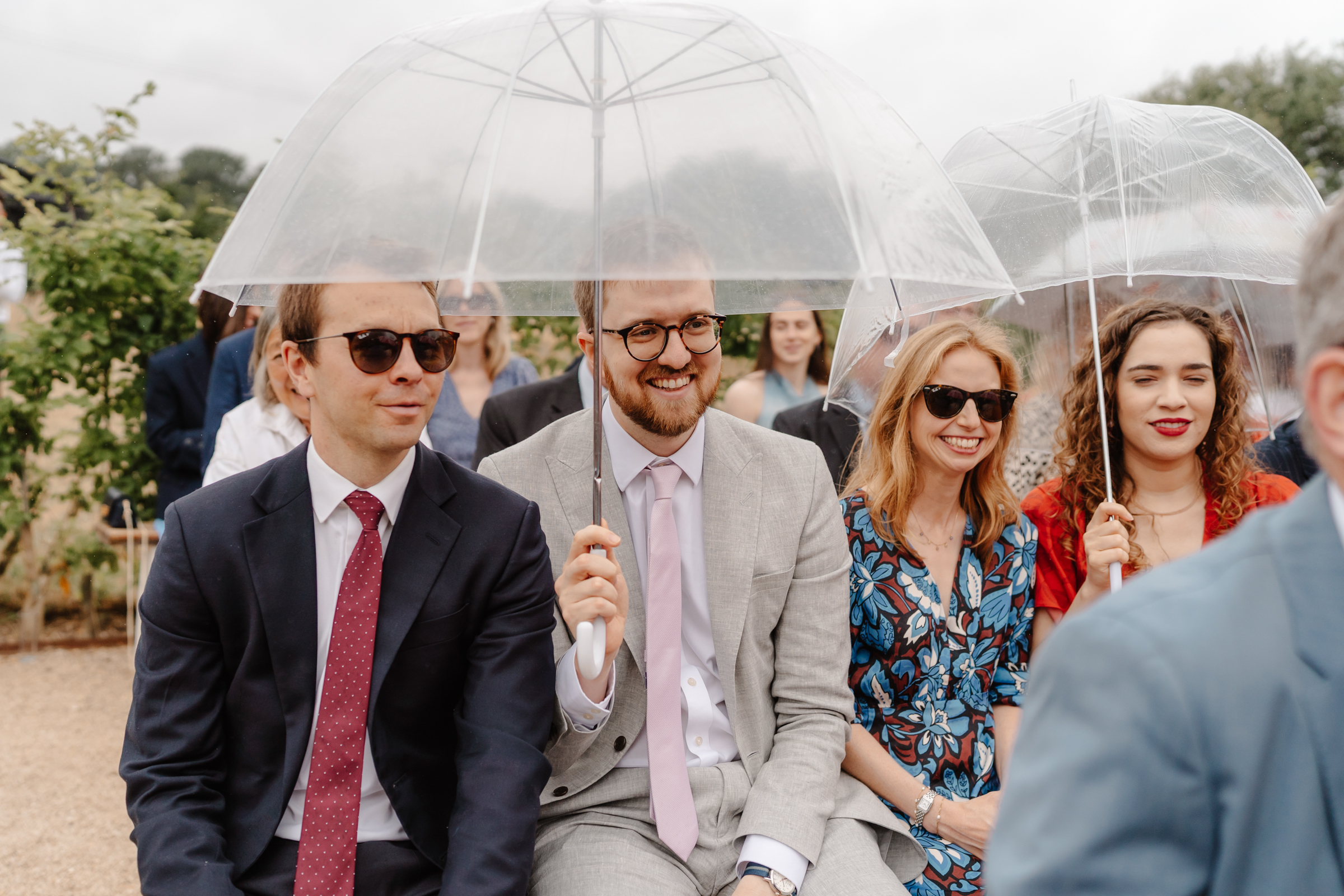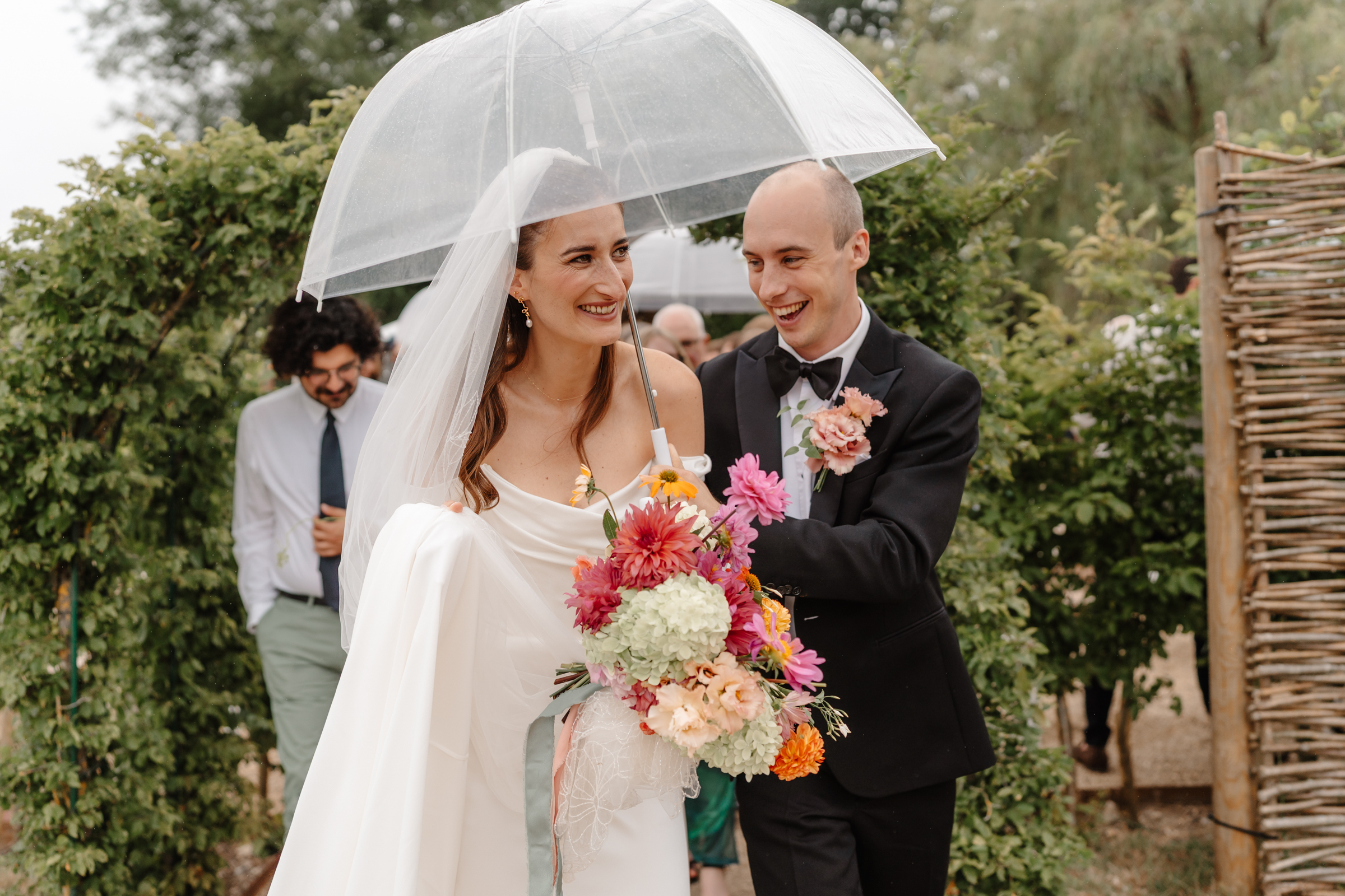 One of the real benefits of a celebrant ceremony is how personal it can be. Sarah Clark had clearly spent time getting to know them both and the ceremony felt entirely their own. It was thoughtful, relaxed and full of meaningful touches you simply don’t get in a standard script. Another advantage of a celebrant-led ceremony is flexibility! When the heavens opened and the rain began to fall, Sarah made the quick call to move everyone indoors (already set up just in case). What followed was such a fun, spontaneous moment – guests grabbed umbrellas and armfuls of ceremony florals, as they made a dash for the barn. Within minutes everyone was inside, flowers included and the ceremony picked up right where it left off.