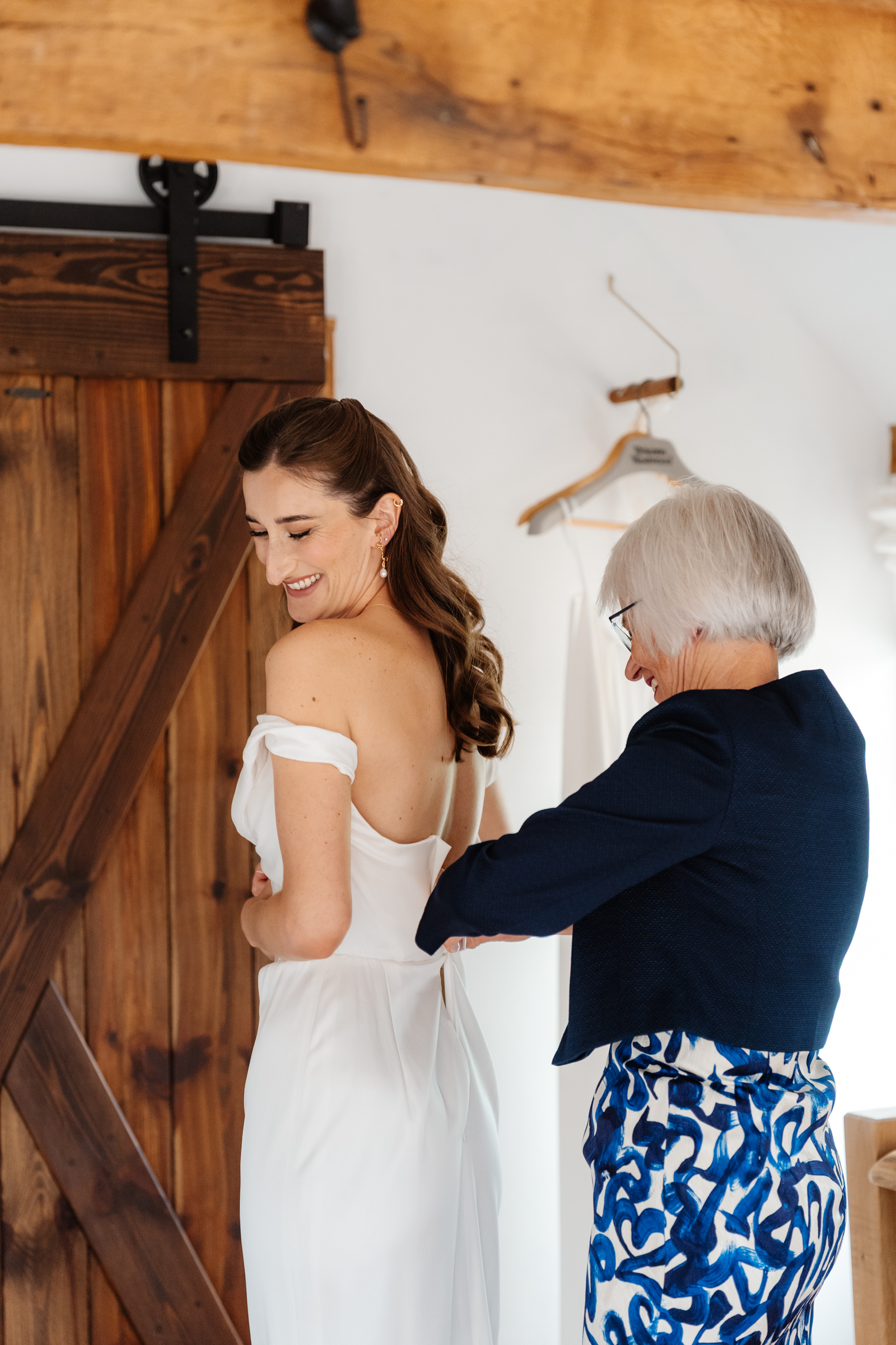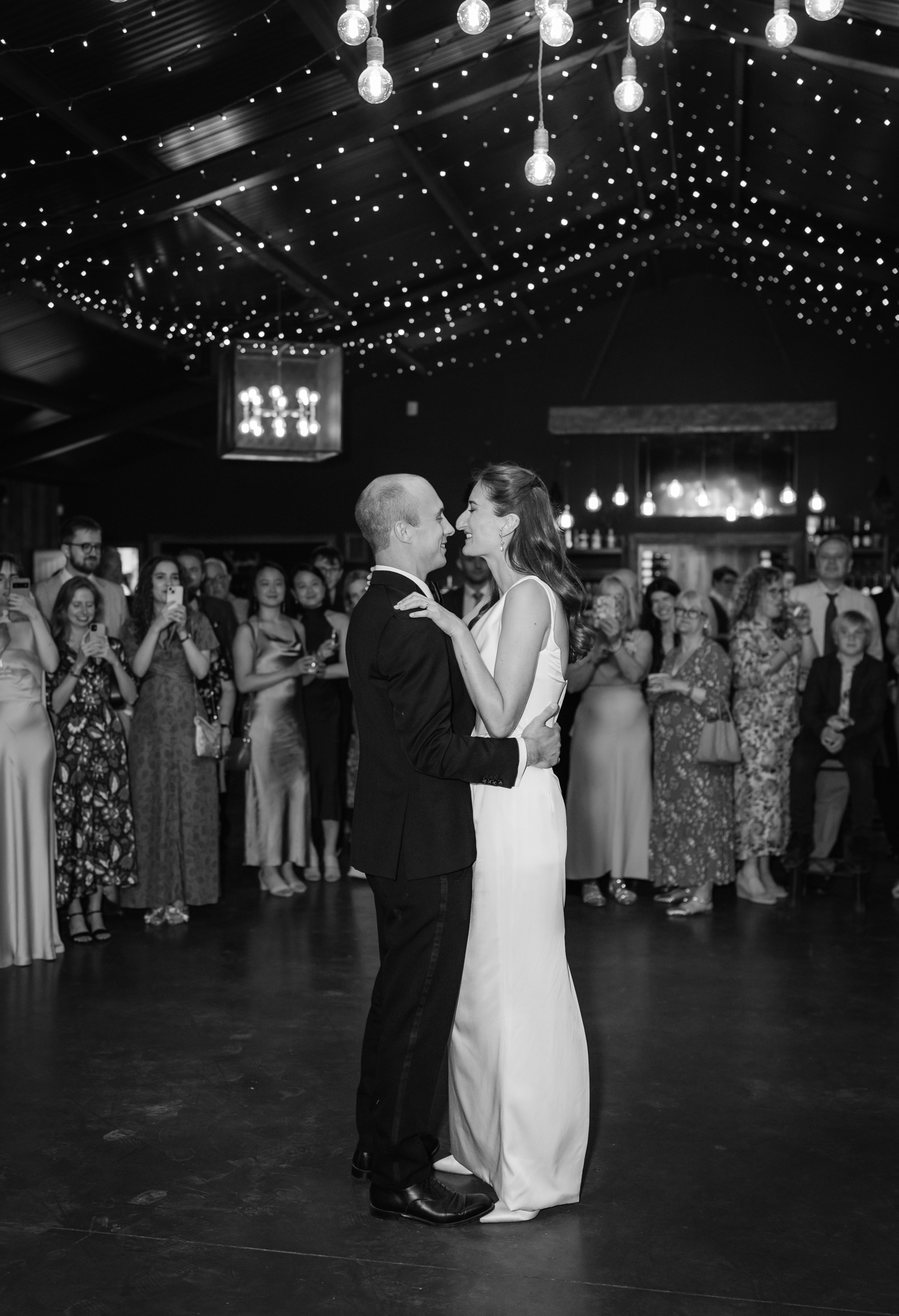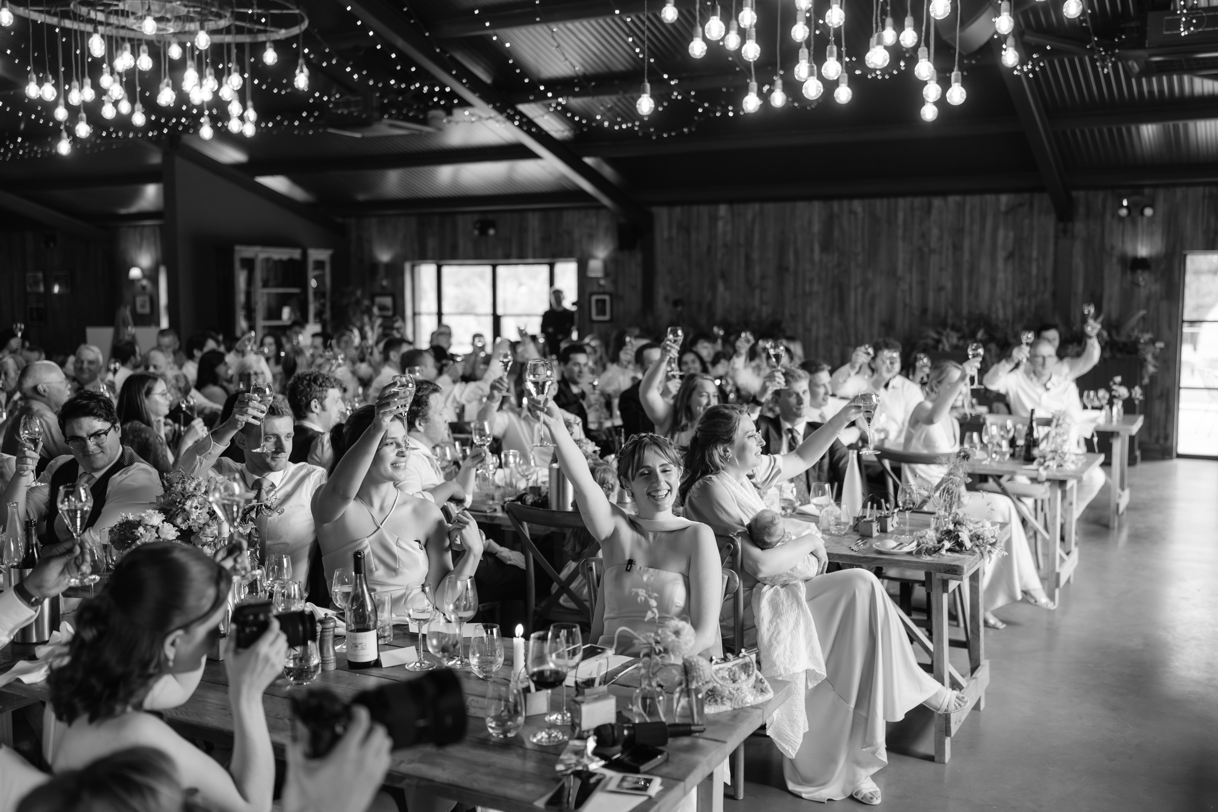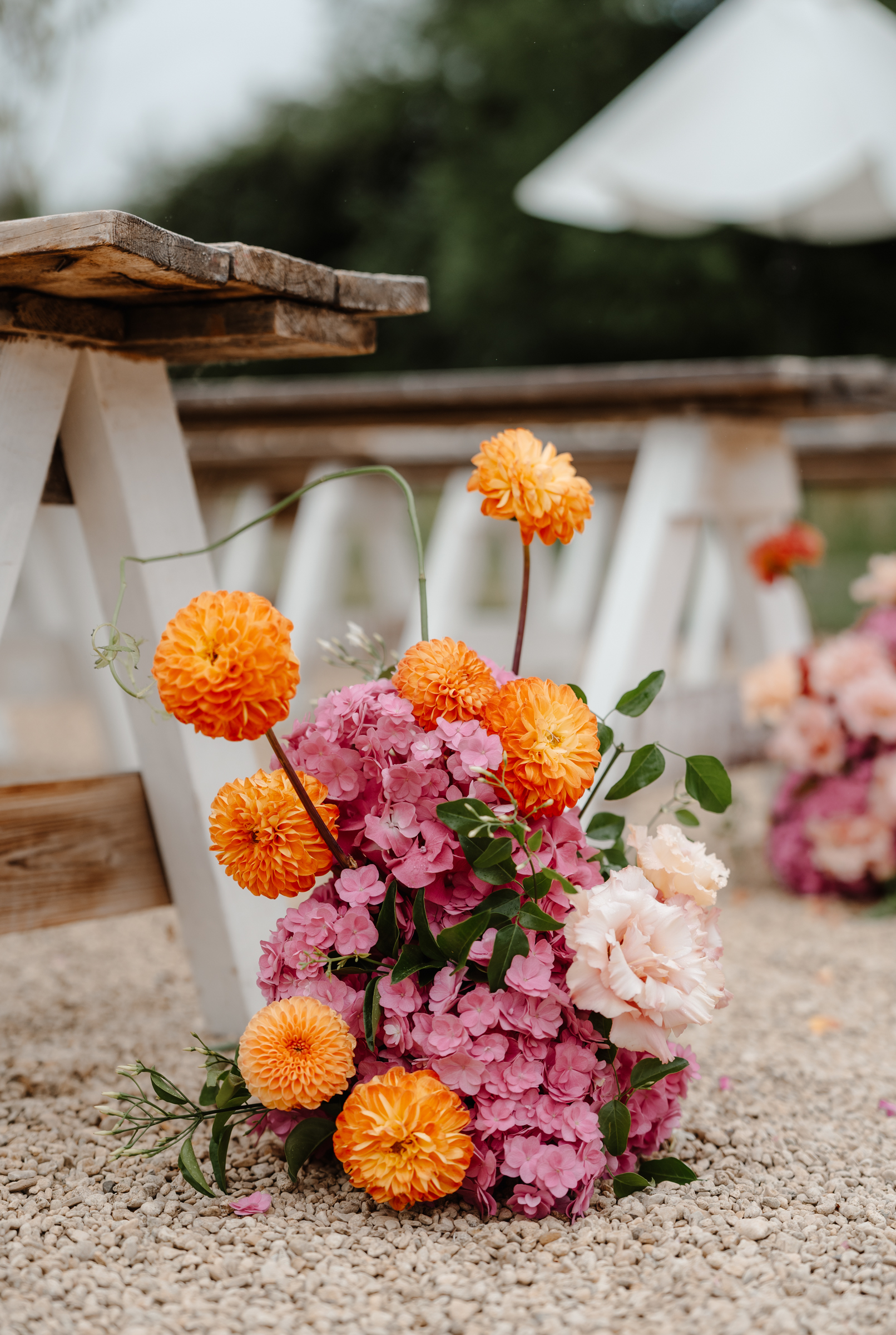 One of the real benefits of a celebrant ceremony is how personal it can be. Sarah Clark had clearly spent time getting to know them both and the ceremony felt entirely their own. It was thoughtful, relaxed and full of meaningful touches you simply don’t get in a standard script. Another advantage of a celebrant-led ceremony is flexibility! When the heavens opened and the rain began to fall, Sarah made the quick call to move everyone indoors (already set up just in case). What followed was such a fun, spontaneous moment – guests grabbed umbrellas and armfuls of ceremony florals, as they made a dash for the barn. Within minutes everyone was inside, flowers included and the ceremony picked up right where it left off.