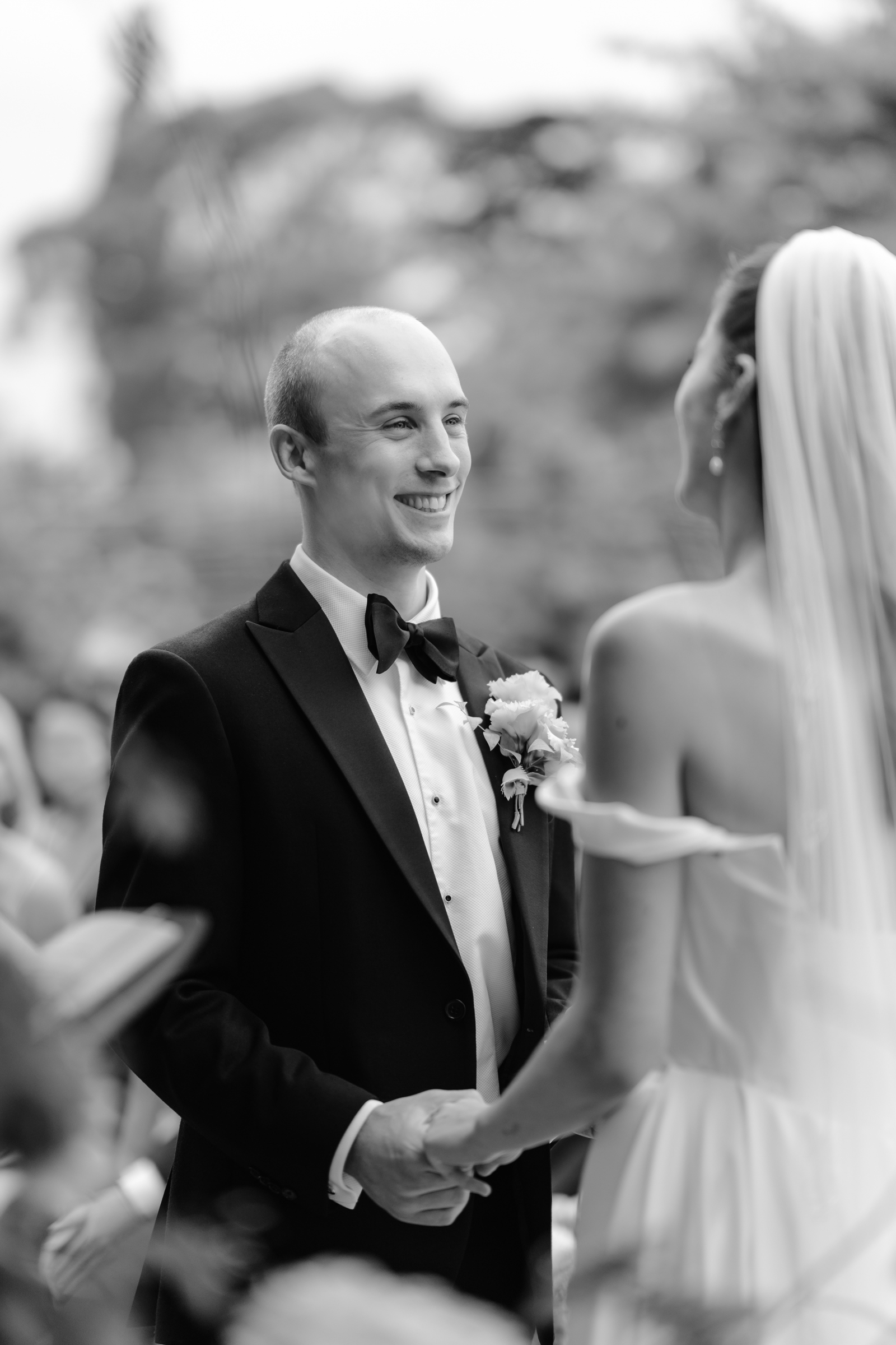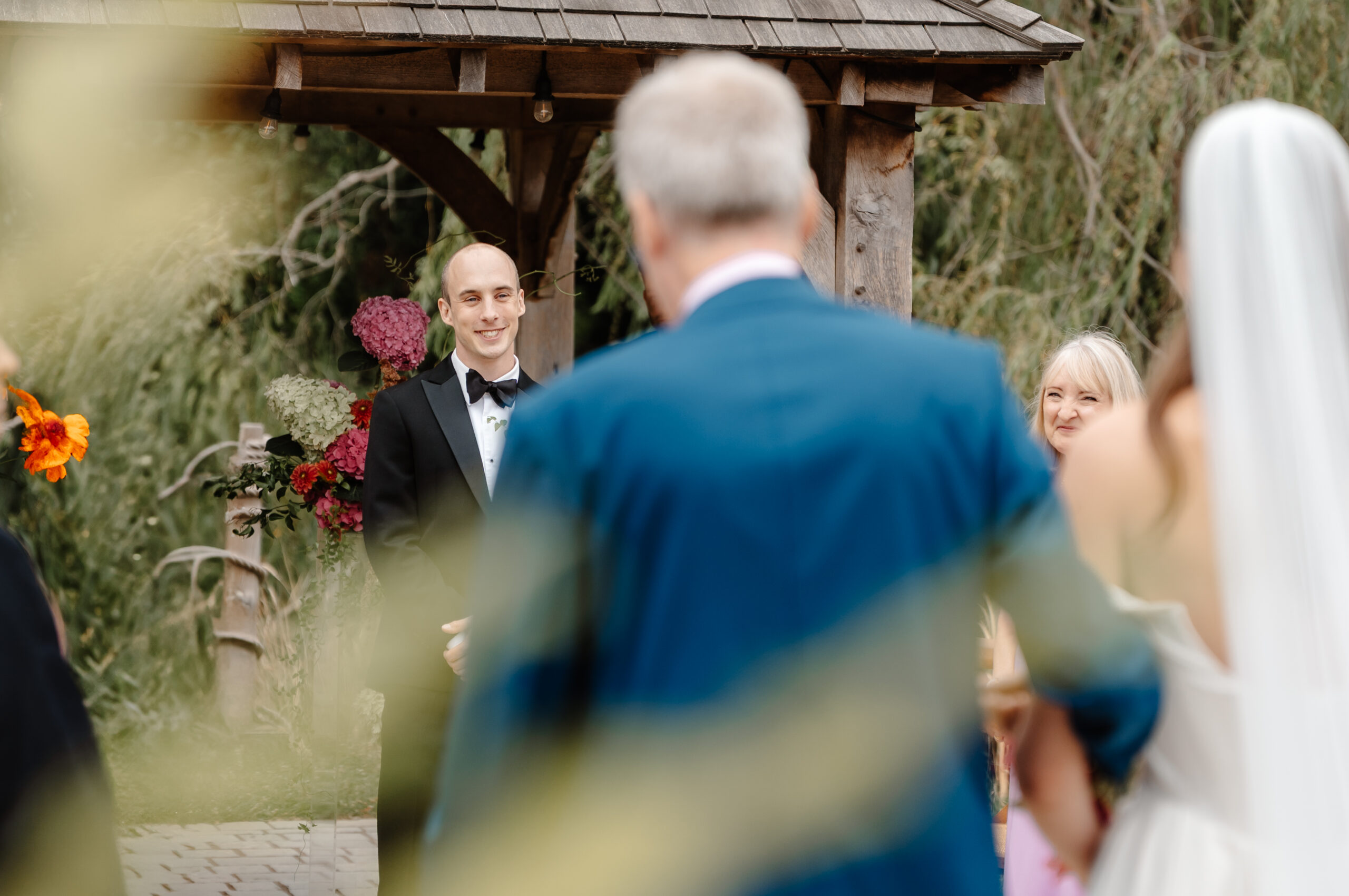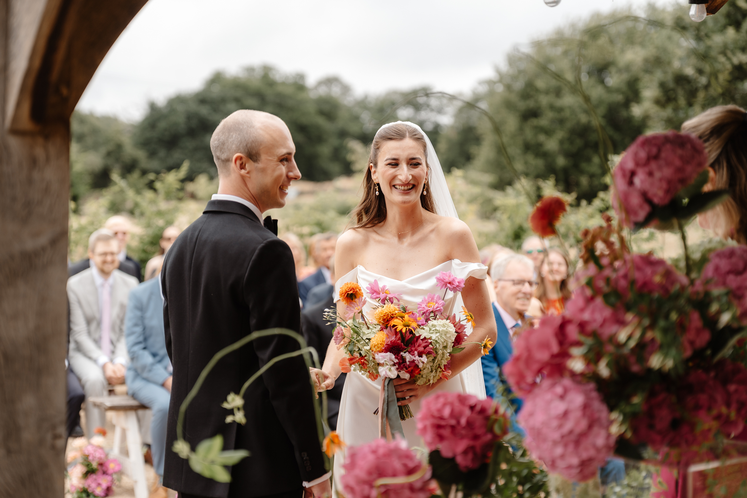 The ceremony began outdoors, led by the wonderful celebrant Sarah Clark. Bride Sarah walked down the aisle with her Mum on one arm and Dad on the other to the most original choice of music – Dos Oruguitas (Two Caterpillars) from Disney’s Encanto. Played live on acoustic guitar, it was incredibly moving, as well as perfectly suited to the couple and setting.