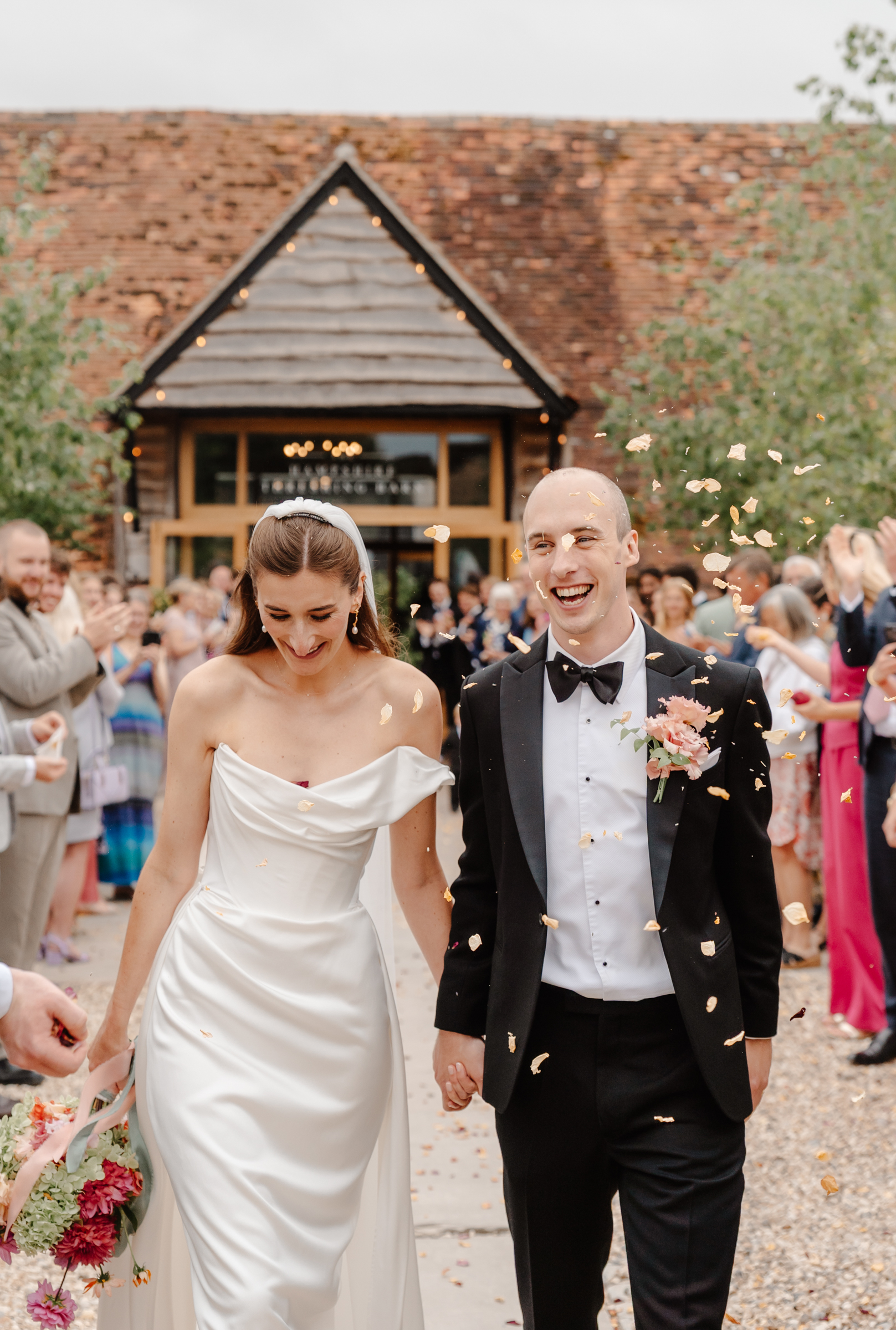 By the time confetti came around, the rain had eased and we were back outside making the most of Silchester’s beautiful countryside surroundings. We moved through group photos against the stunning rural backdrops the venue offers before guests headed inside for the wedding breakfast.