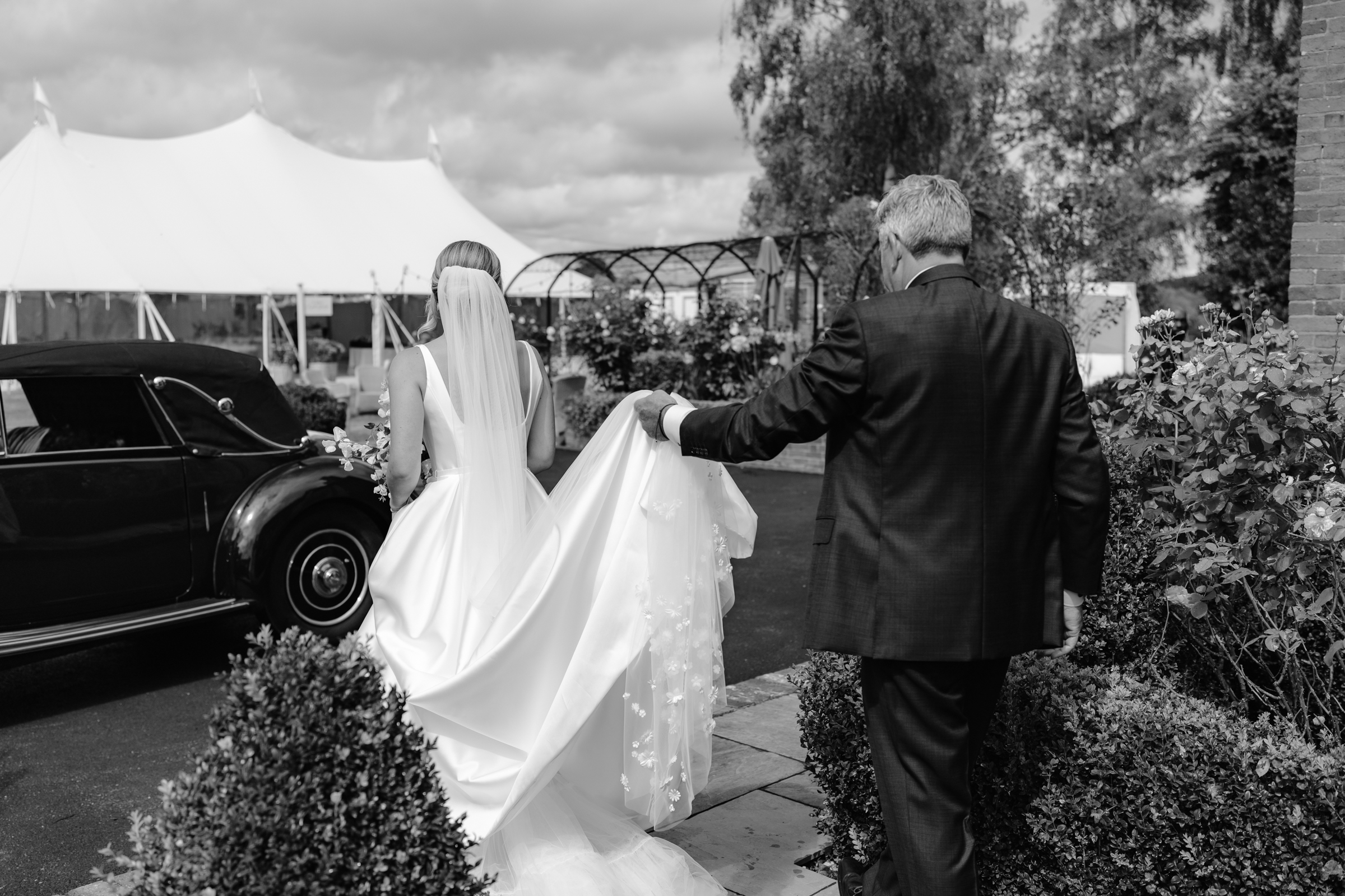 After the ceremony and confetti, Lydia & George made their exit in a timeless Bentley Convertible. As they arrived back at Lydia’s parents’ home, guests gathered on the lawn to welcome them in cheering and waving as the car came down their long driveway.