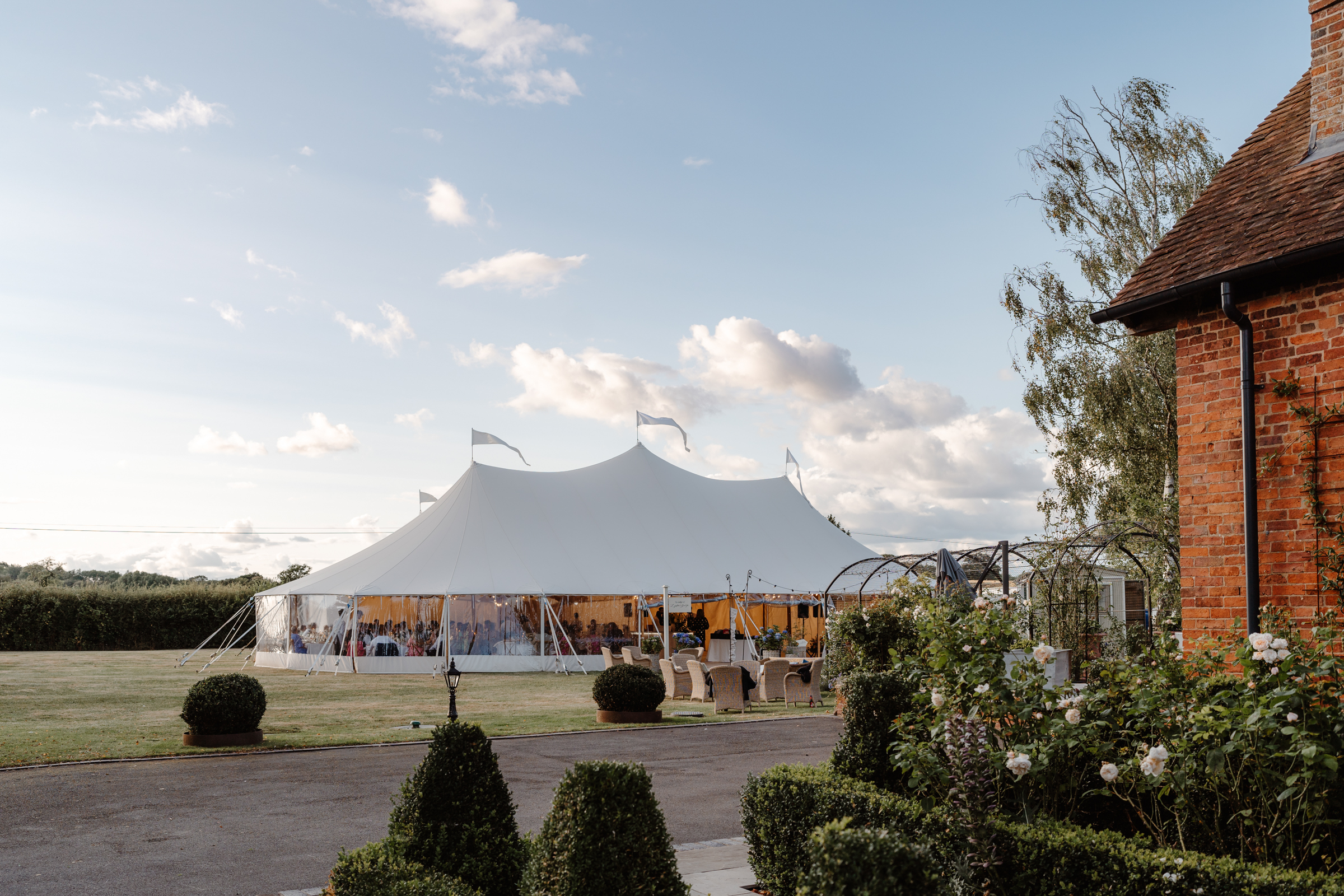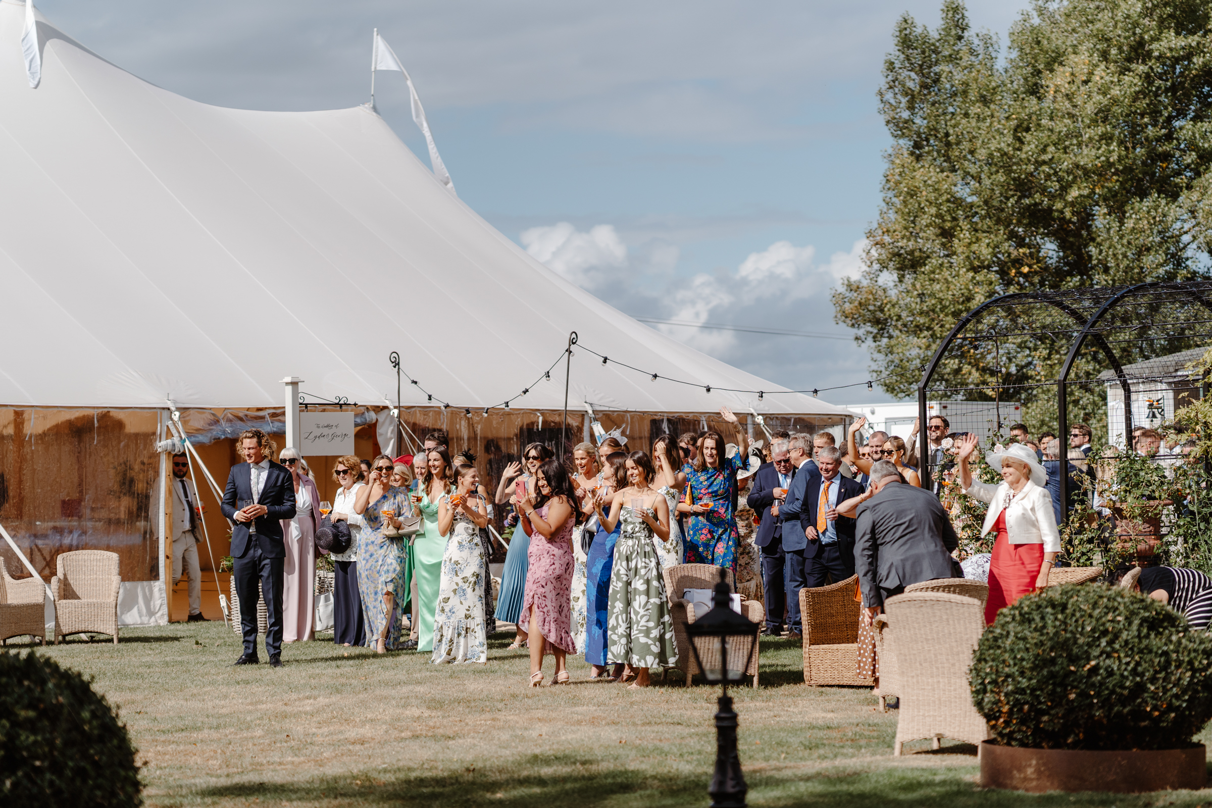 They were greeted by a gorgeous marquee set-up and a drinks wagon ready and waiting. The atmosphere was relaxed straight away – guests mingling on the lawn, drinks in hand, enjoying the late August sunshine.