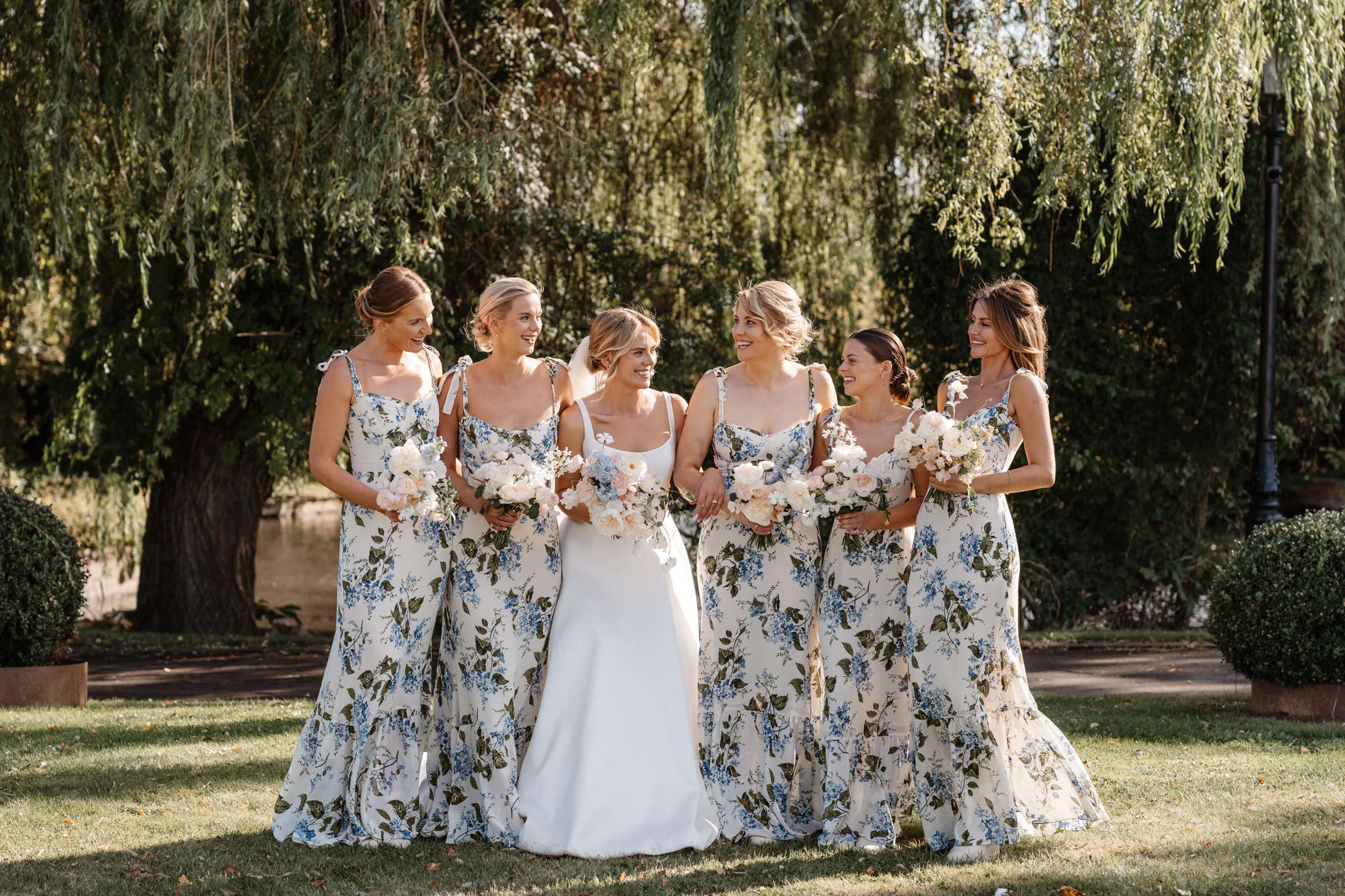 Lydia wore a timeless and elegant gown by British designer Suzanne Neville. The beautiful ‘Bussotti’ dress featured a classic cut with a square scoop neckline, delicate bodice seaming, thin belt and pleated A-line skirt. Her bridesmaids wore blue floral ‘Hydrangea’ Reformation maxi dresses, which I have to say are some of my favourite bridesmaids dresses I’ve seen.