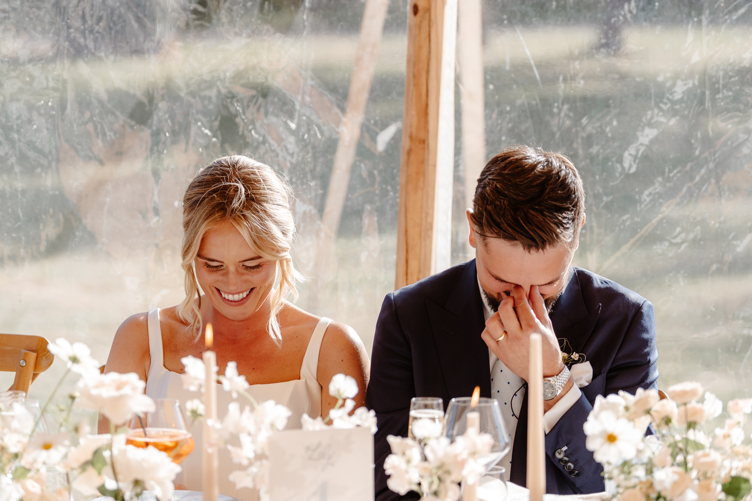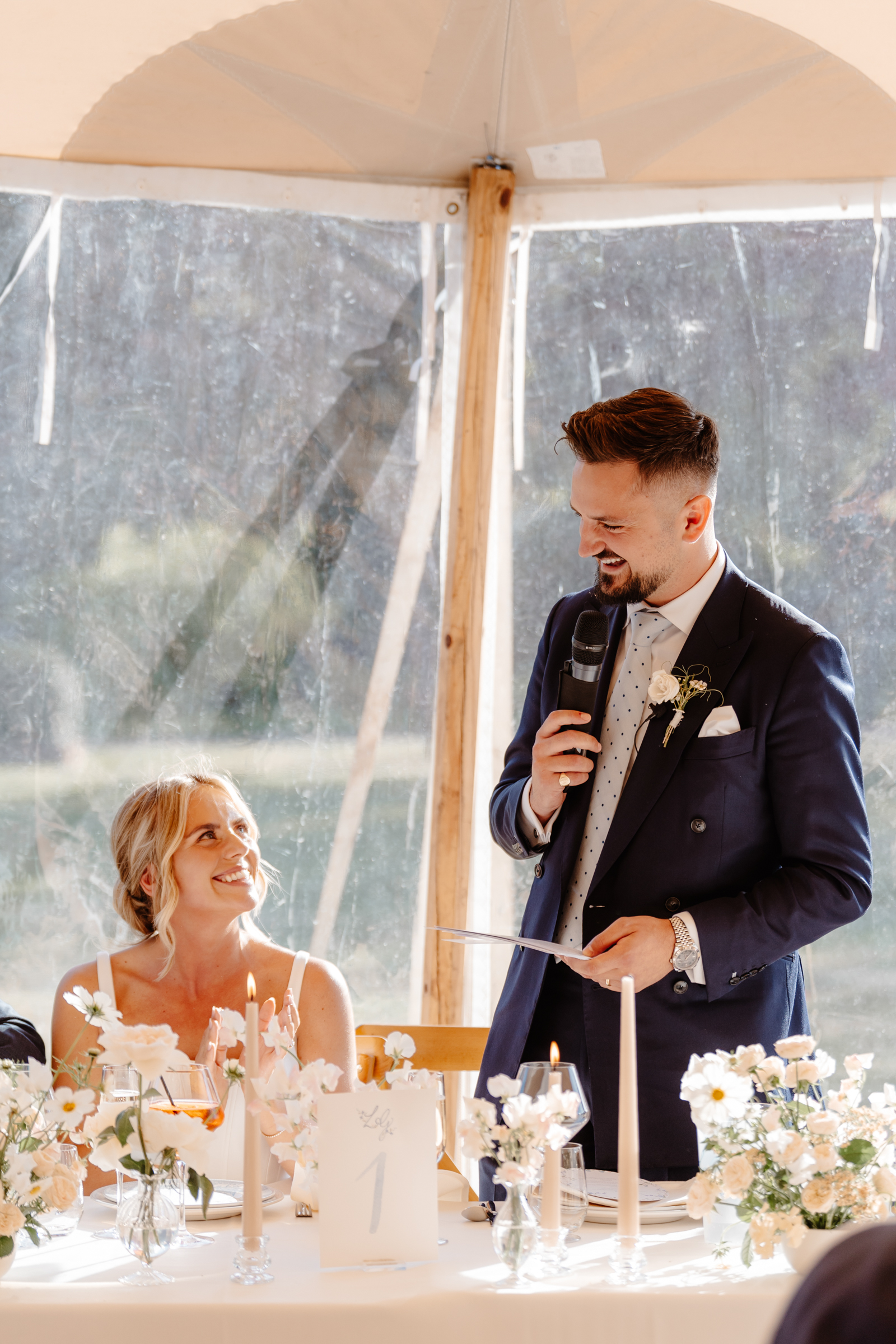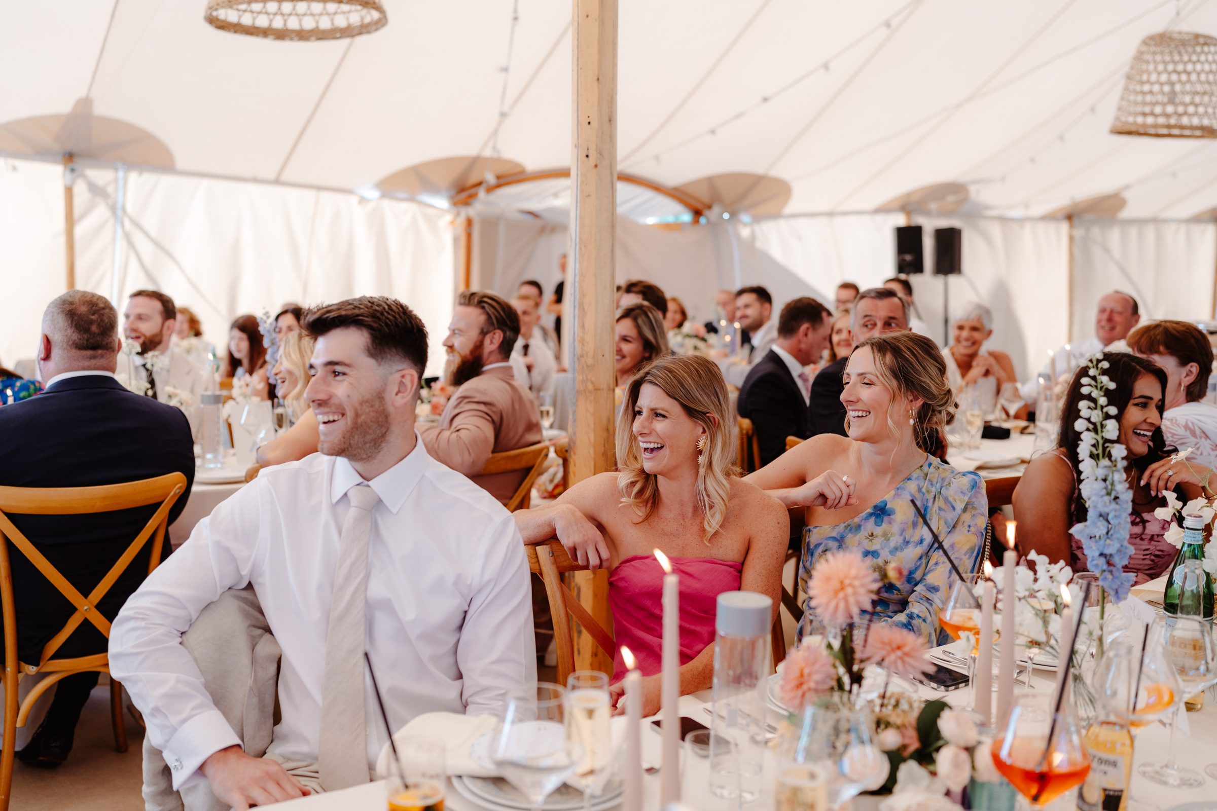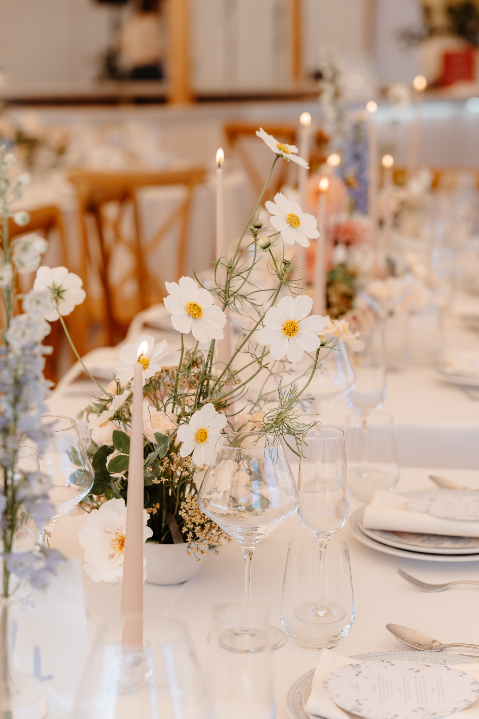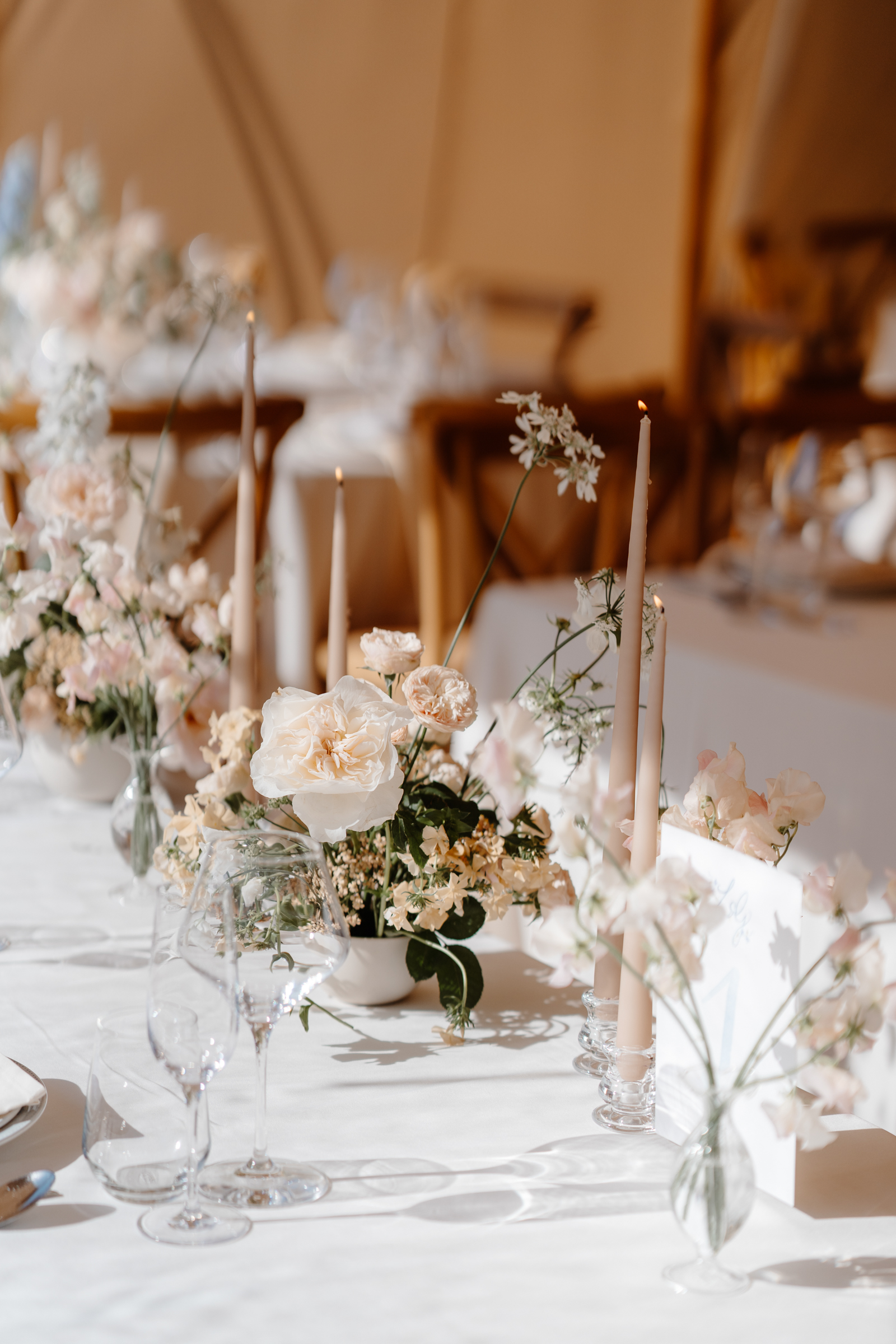 Inside the marquee, the styling was soft and romantic with pastel florals and candles. Pretty tones of white, blush pink and subtle hints of blue woven throughout the space.